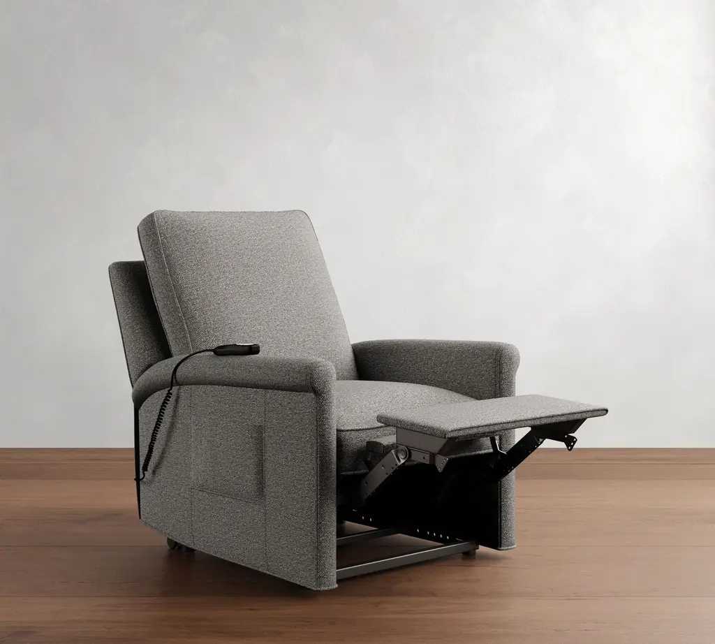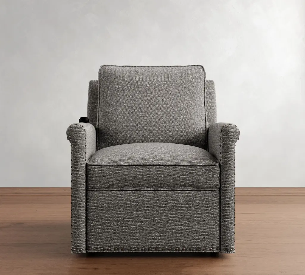 Our Tyler Collection doesn't skimp on comfort or style, even with its slim profile. This recliner is made for lounging. The classic silhouette features rolled arms and is completely customizable—it's made to order in your choice of fabric, with or without nailheads. A power lift design helps you get up and out of your seat more easily.