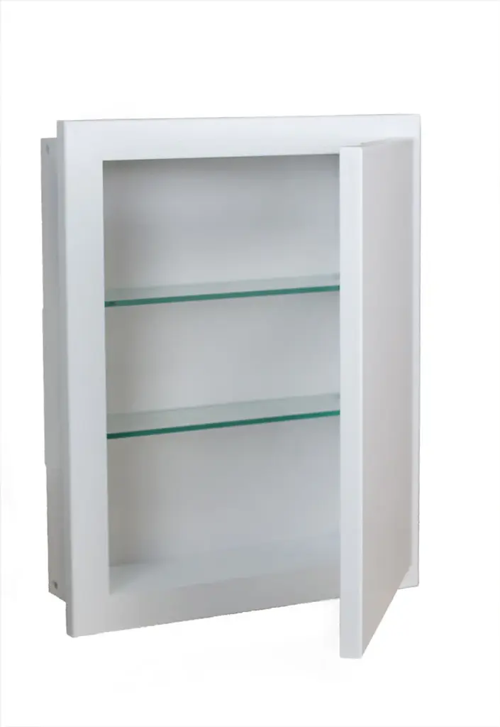 Recessed in the wall between studs! Easy installation. Simply put construction adhesive (not included) on the back side of the frame and push it into the opening in your drywall, or you can screw it to the studs on each side. Three fully adjustable glass shelves. Concealed hinges with soft close built in, door is left undrilled for a knob or handle so you can mount it to open either direction. Measures 19.5h x 15.5w x 3.5d. White enamel finish. MDF door. Handcrafted in Sarasota, Florida. Requires an opening in your wall of 14 1/8w x 28 1/8h. Framing in the wall around the opening is not necessary. Interior dimensions: 28"h x 14"w x 3.5"d
