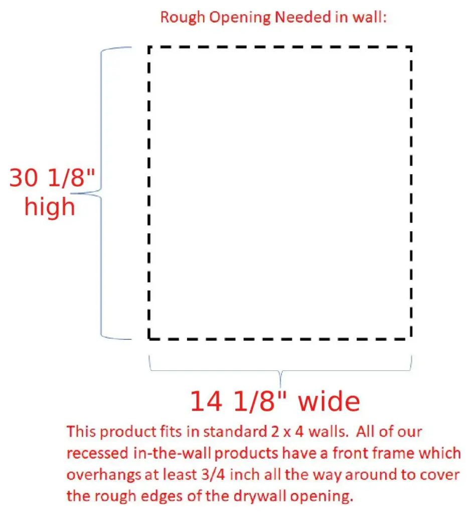 Recessed in the wall between studs! Easy installation. Simply put construction adhesive (not included) on the back side of the frame and push it into the opening in your drywall, or you can screw it to the studs on each side. Four fully adjustable glass shelves. Concealed hinges with soft close built in, door is left undrilled for a knob or handle so you can mount it to open either direction. Measures 31.5h x 15.5w x 3.5d. White enamel finish. MDF door. Handcrafted in Sarasota, Florida. Requires an opening in your wall of 14 1/8w x 30 1/8h. Framing in the wall around the opening is not necessary. Interior dimensions: 30"h x 14"w x 3.5"d.