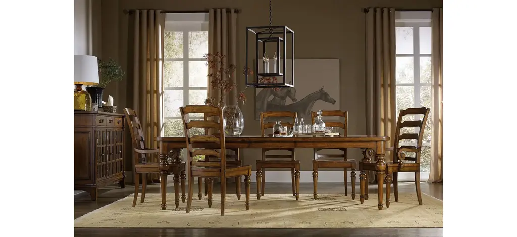 Exuding the grand style of a Manor Home, the Tynecastle Rectangular Dining Table invites up to 10 guests to gather around and linger, admiring the warm chestnut-colored finish revealing the rich character of figured Alder veneers. With two 18-inch leaves, the table extends to 114 inches to accommodate up the 10 guests. Crafted of Poplar Solids and Figured Alder Veneers.