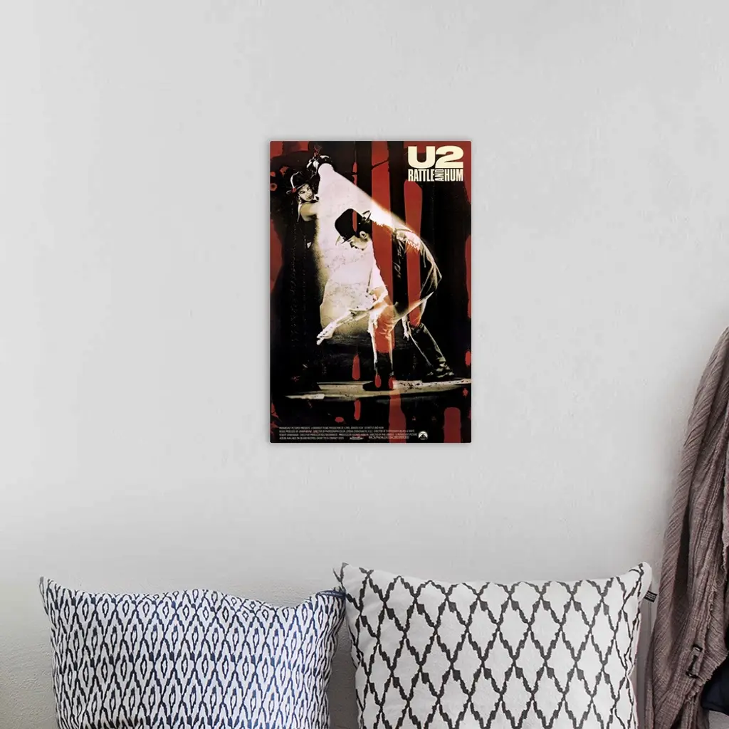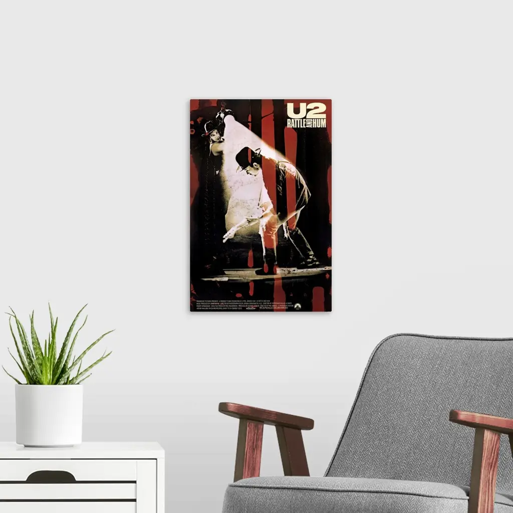 Large print of a musician playing a guitar with a person behind him shining a spotlight on him.