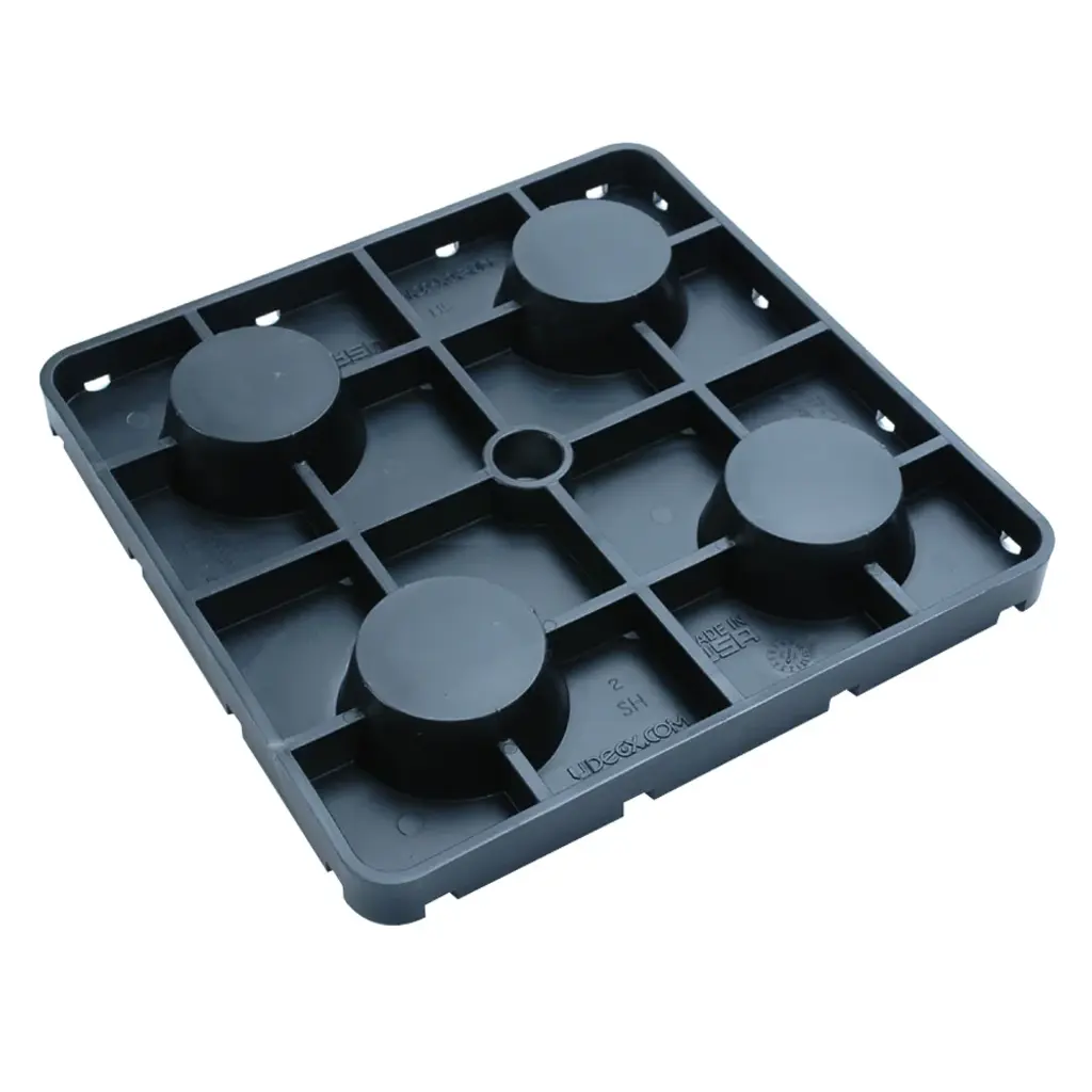 The UDECX Patio Decking 11.4 in. x 11.4 in. Black 1 in. Shim is a UDECX patio deck accessory. The shim adds 1 in. of height to an UDECX pier. If the ground is not level, shims are used to level the system. The Shim is placed under the Pier during assembly.