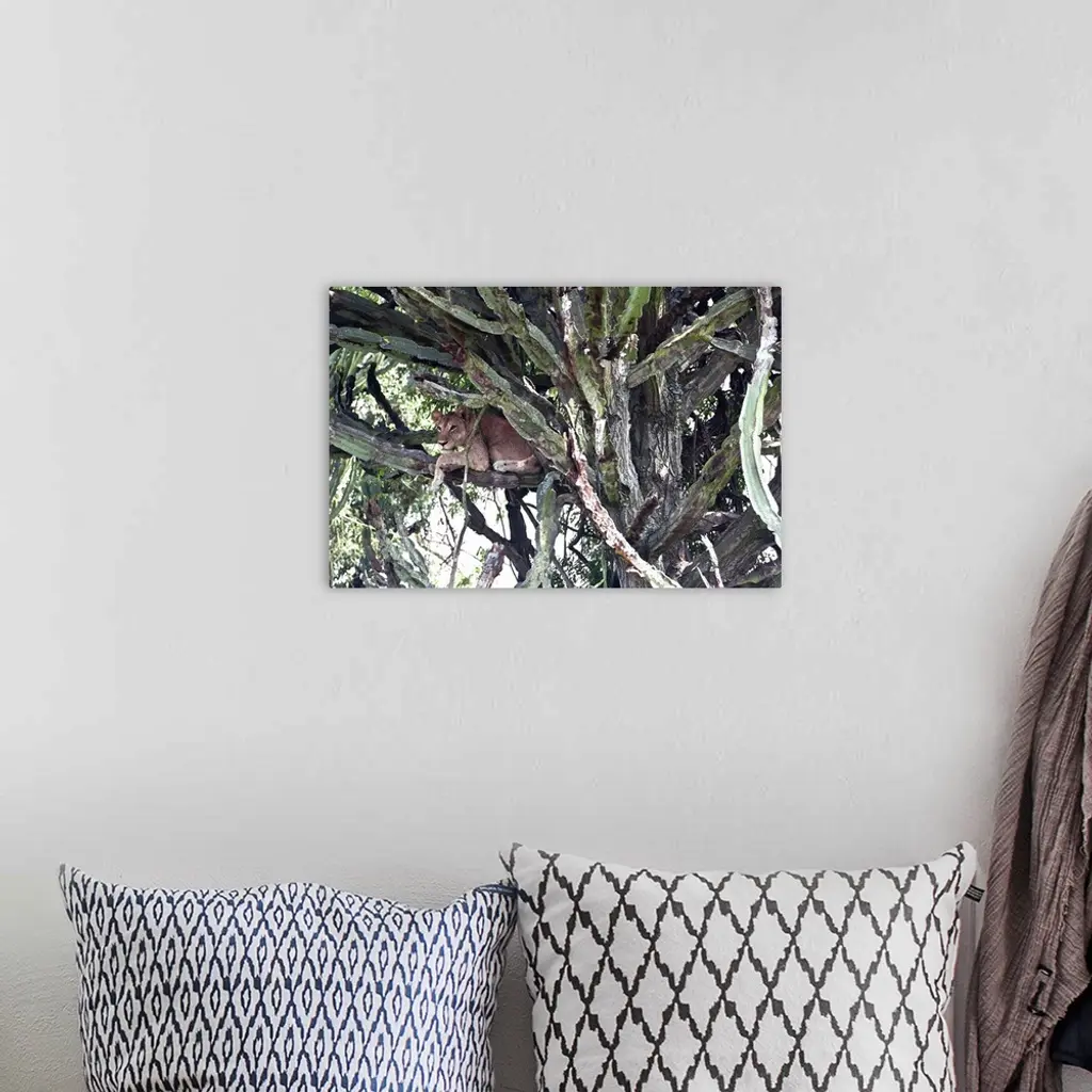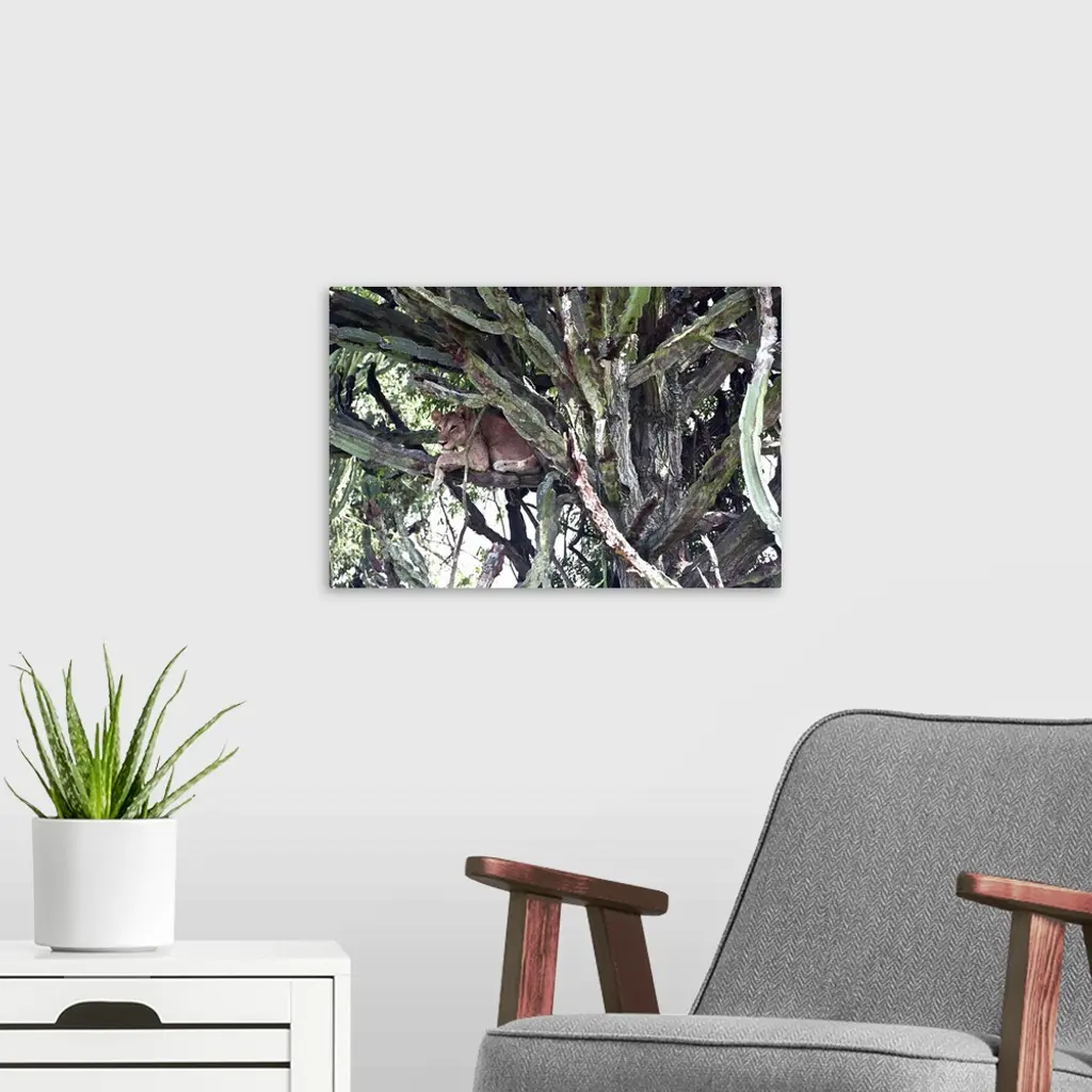 Uganda, Queen Elizabeth National Park, Tree climbing lioness resting on euphorbia tree wall art for home and office decor. Discover canvas art prints, photos, mural, big canvas art and framed wall art in GreatBigCanvas.com's varied collections.