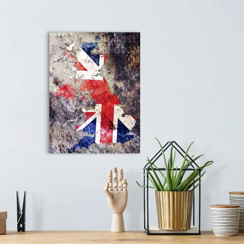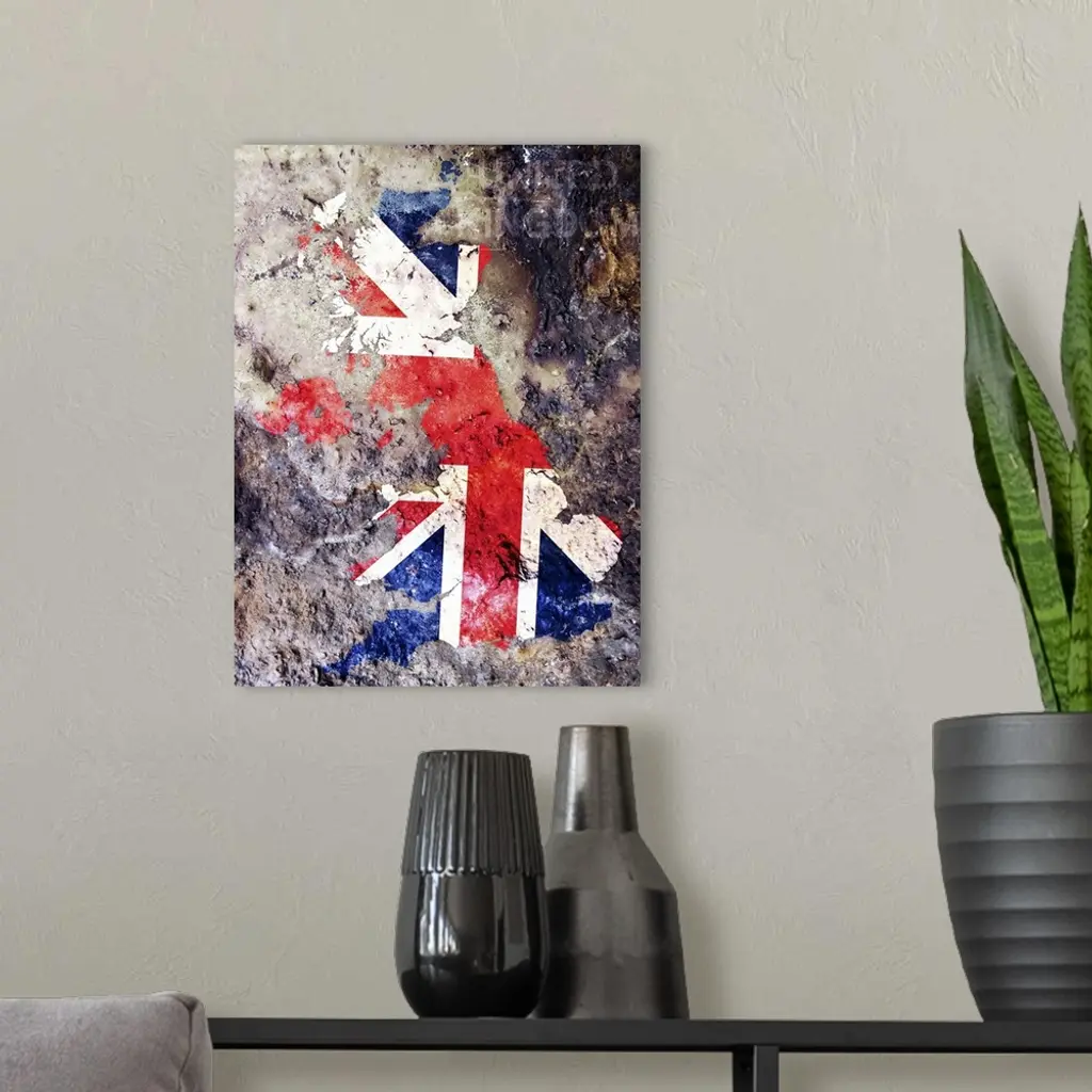 United Kingdom Union Jack Flag in shape of the United Kingdom in a grungy paint style.