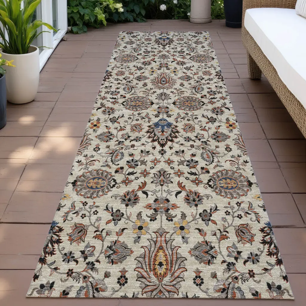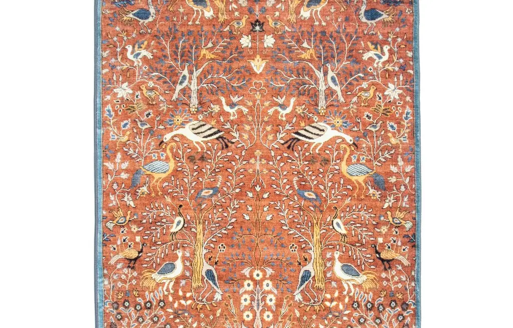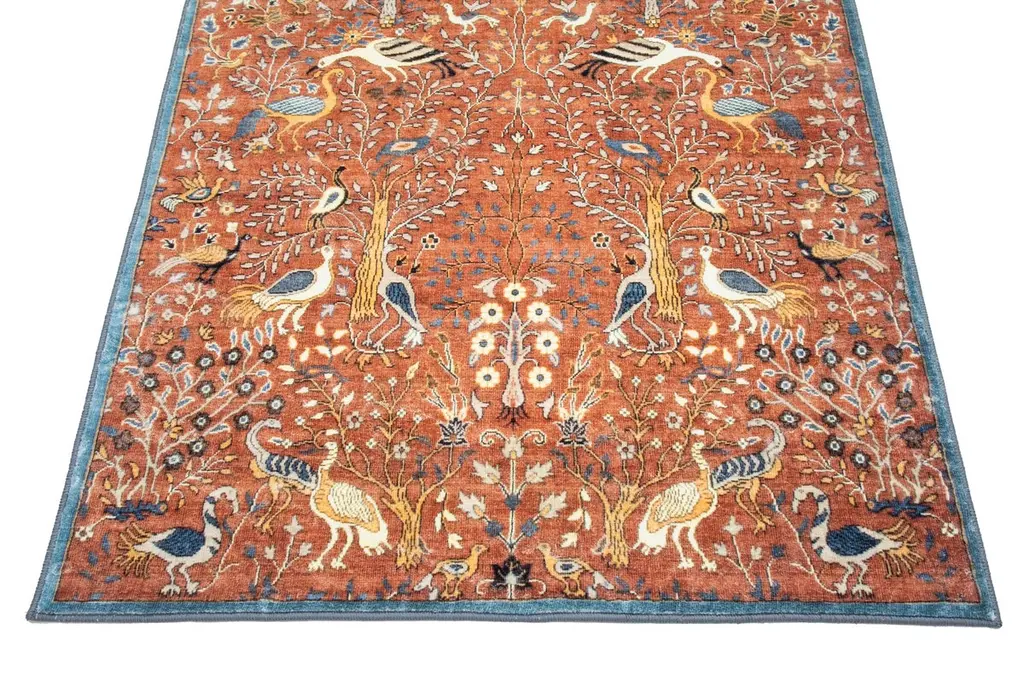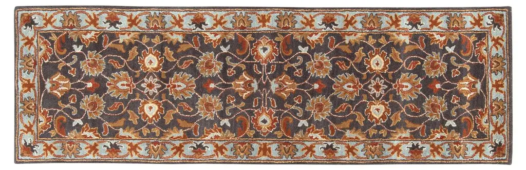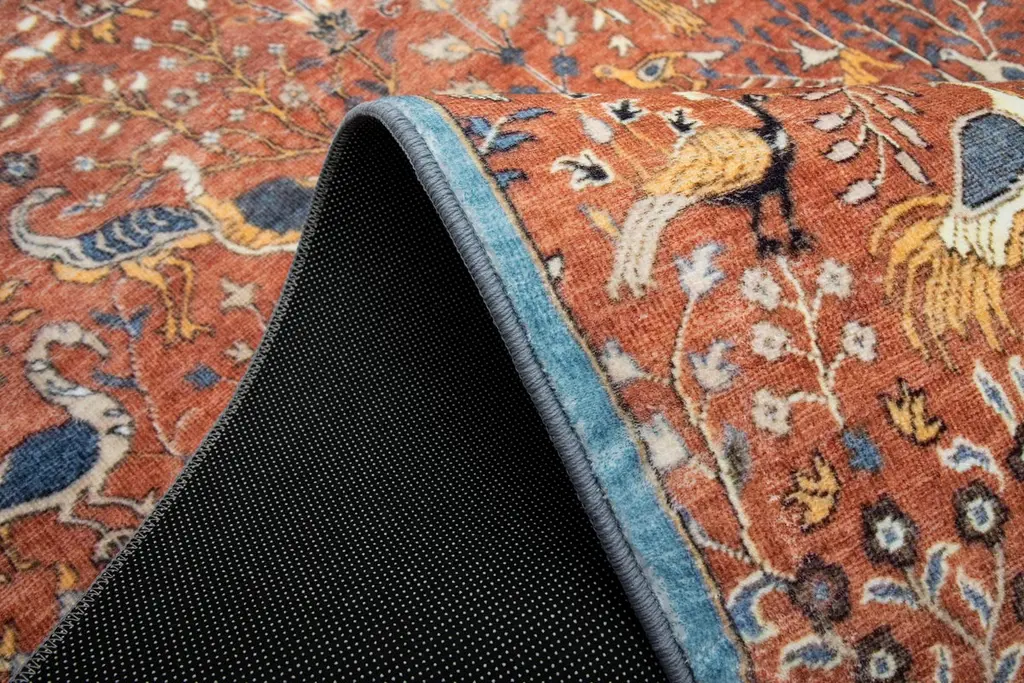 Tufted, premium ultra soft 1/4" pile with non-slip padded backing.2'6" x 8'NewOrigin: ChinaField Color: Burnt-OrangeBorder Color: BlueAccent Colors: Blue, Ivory, Black, YellowTufted faux silk pile on a non-slip polyester foundation.