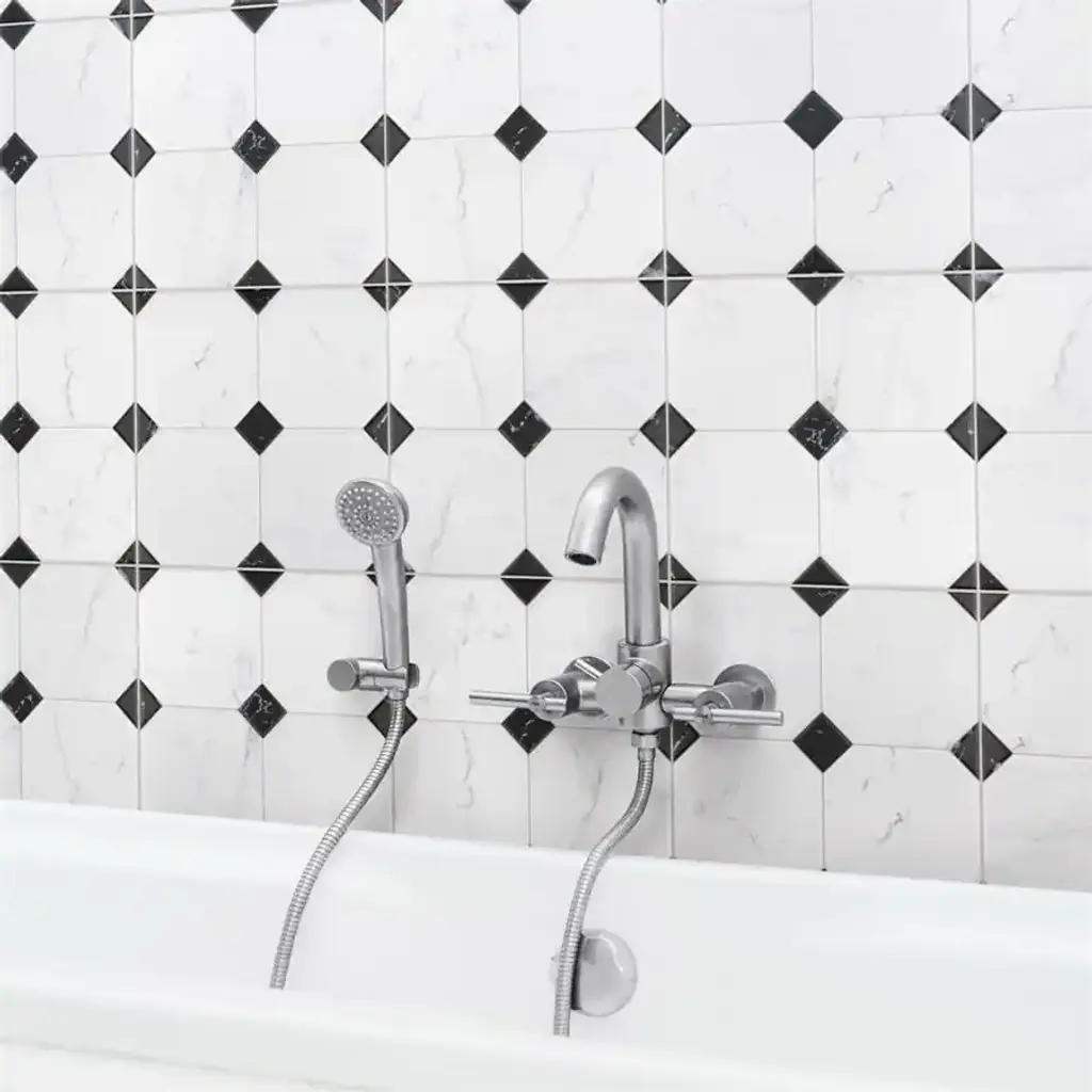 Perfect for bathrooms in need of a stylish makeover, this wall-mount bathtub faucet is a delight for both residential and hospitality settings. It features a slender, elongated tub spout that moves from left to right 180 degrees for greater reach and convenience. When not in use, the smart swivel design keeps it out of the way for a sleek, clean look. While a handheld shower at easy access improves your bathing experience, a 2-function valve makes operation a breeze. Comes in brushed nickel, it fits into your existing decor effortlessly.