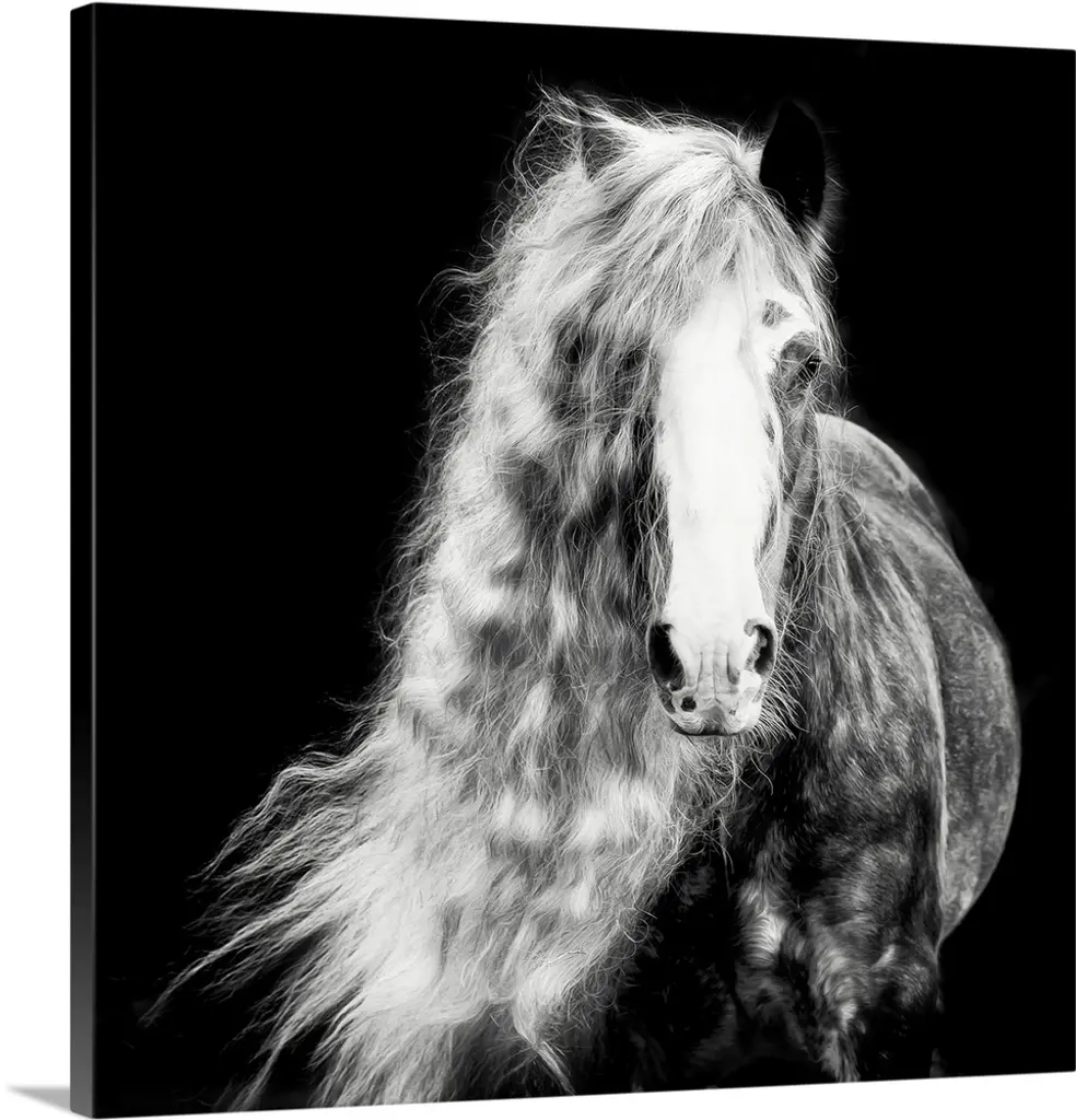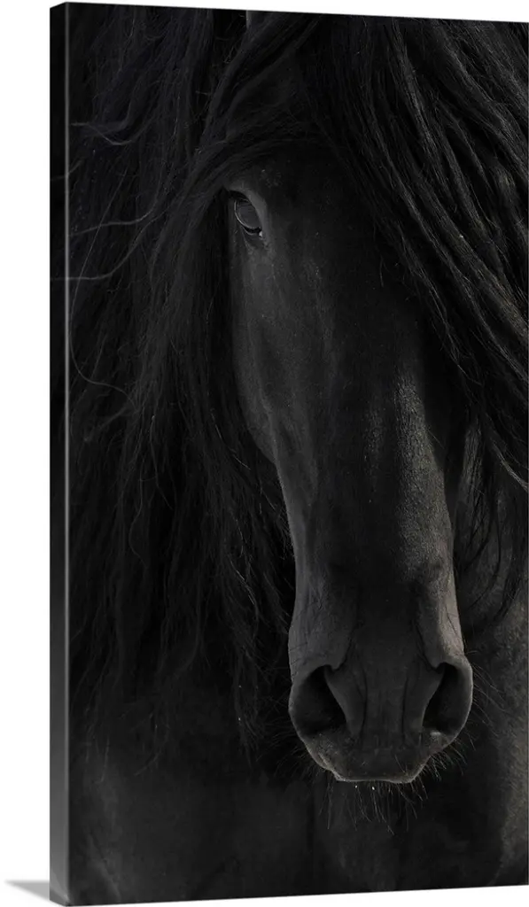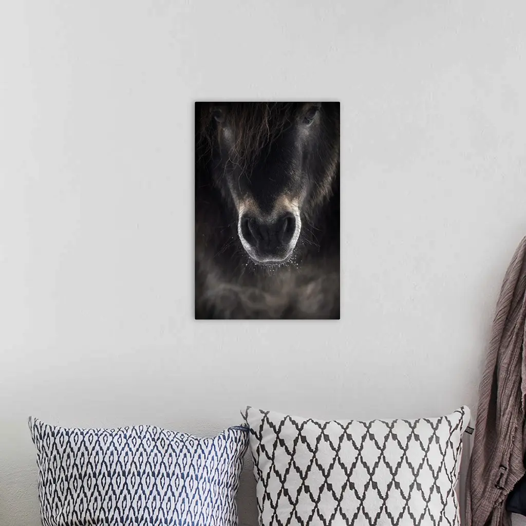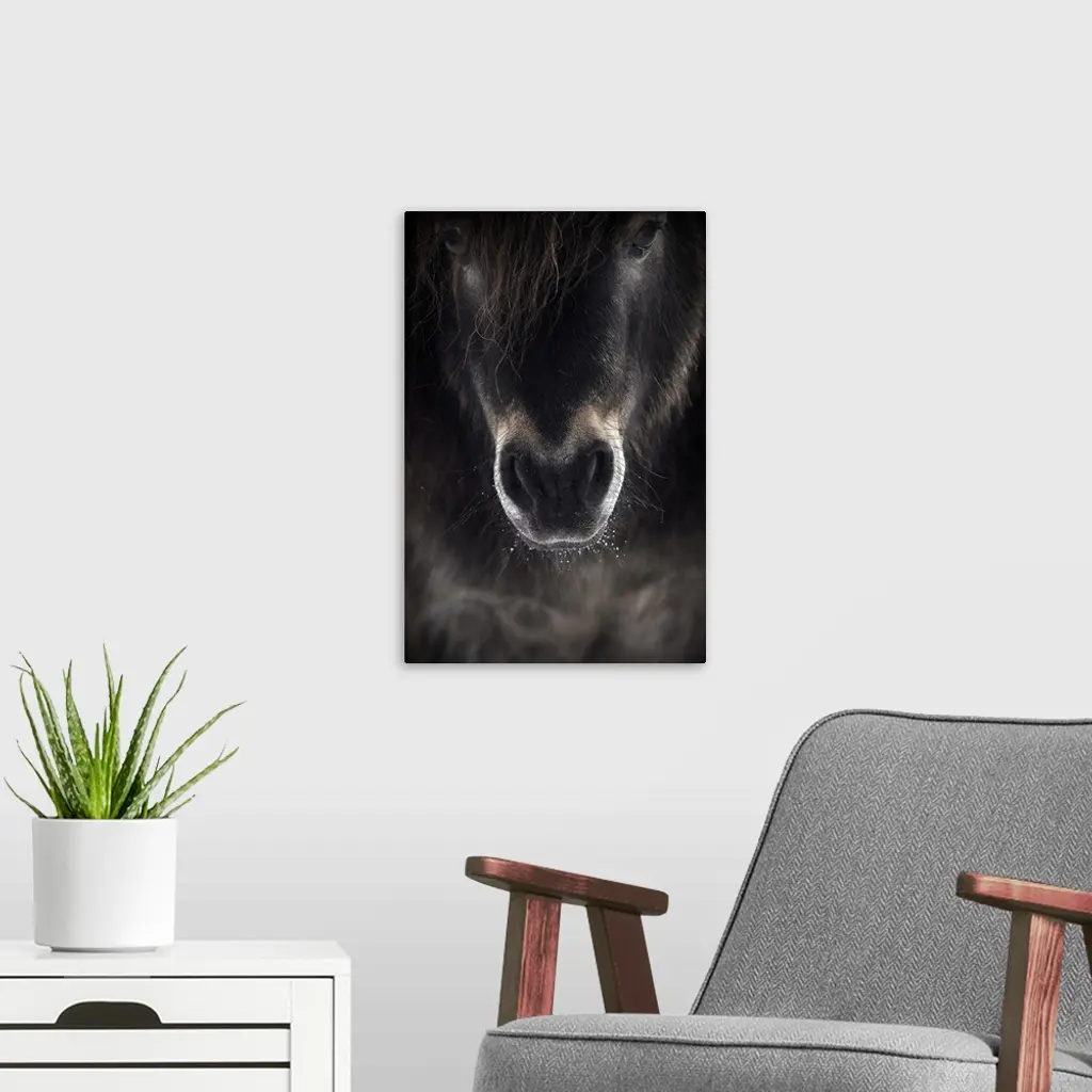 Portrait of a horse with beads of water on its whiskers by its mouth.