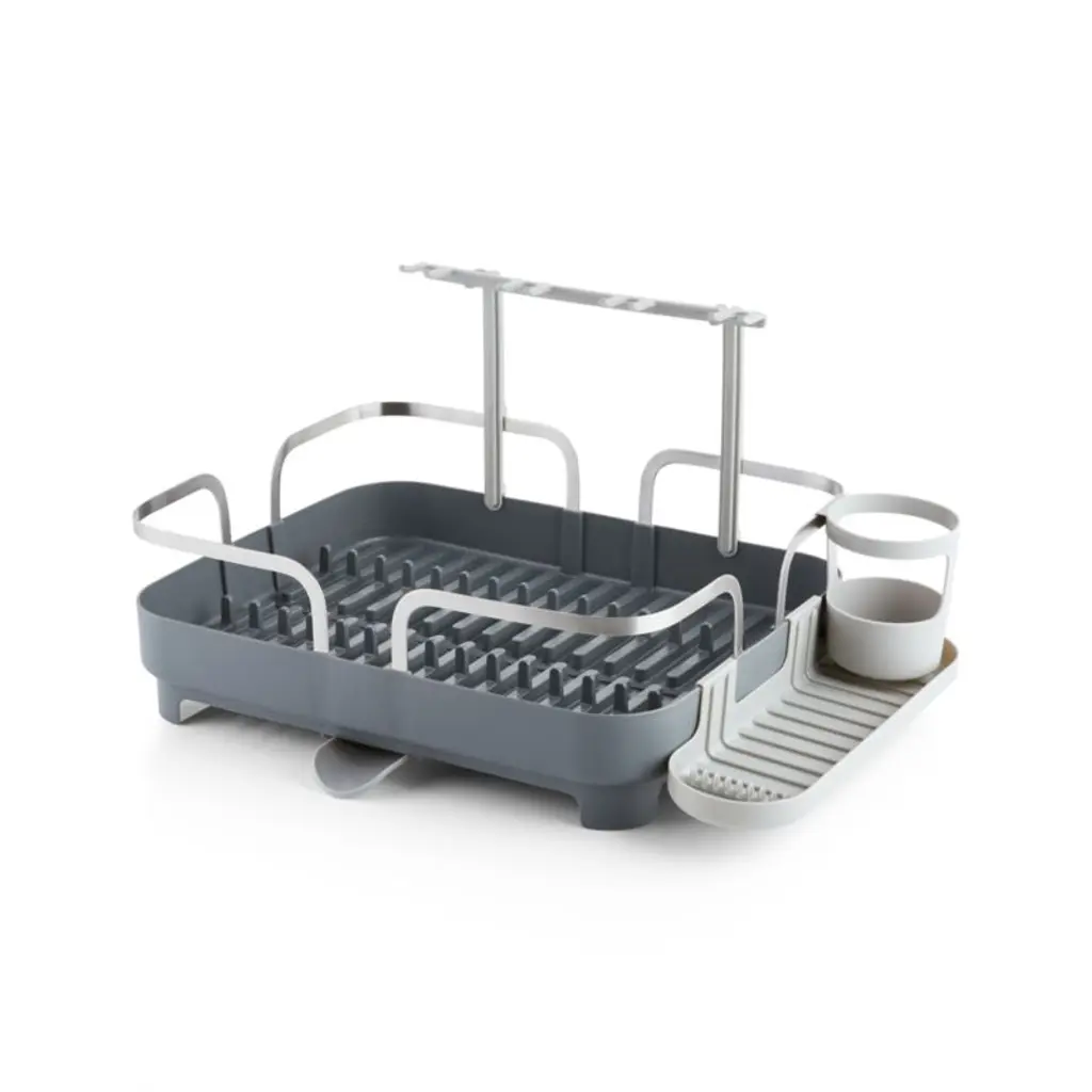 Stainless steel encircles a flexible, versatile dish rack in modern shades of grey. With its movable stemware holder and drain spout, the rack ably adjusts to your particular space and each load of dishes. The main rack fits up to 15 plates or a combination of dishes, drinkware and cookware. Built-in hooks on the stemware holder hang wine glasses or mugs so they dry thoroughly. A utensil caddy wrangles flatware, while the side tray holds knives, glasses and various small items. All horizontal surfaces are ridged, allowing water to drain away and run out the drainage spout.