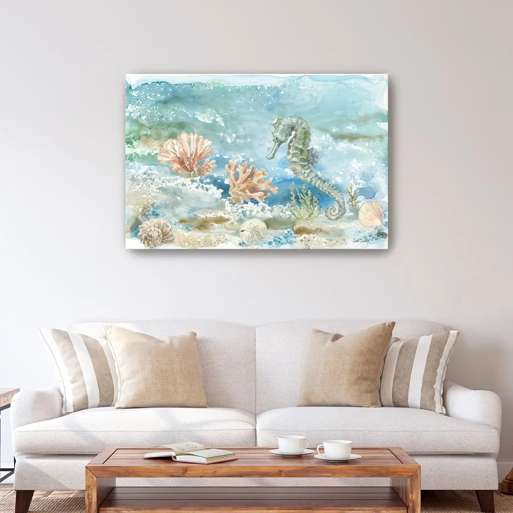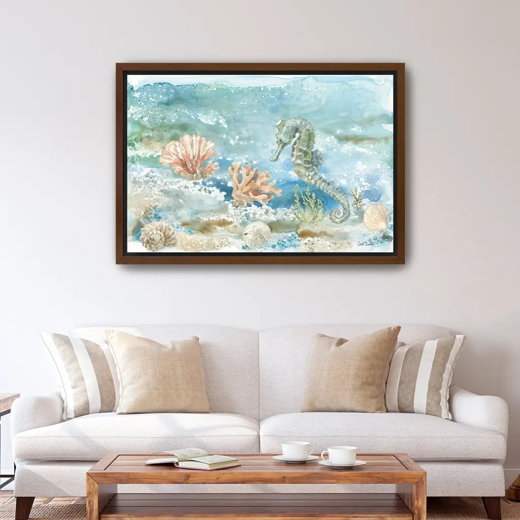 Infuse your space with the serene beauty of the coast through this captivating abstract coastal canvas art print. This piece features a harmonious blend of soft blues, sandy beiges, and gentle whites, evoking the calming essence of ocean waves and coastal breezes.Available in black frame, dark walnut frame and oak frames, or as a frameless canvas. Our Gallery Wrap Canvas Prints are proudly assembled with high quality materials in California, USA. Each piece is printed on a thick, archival grade canvas using Giclee technology. It is then hand-stretched by our experienced artisans over solid pine bars, which will not warp over time. The final product is a piece personally crafted for you to confidently display on your wall. Care and Assembly: Ensure that the location of your piece has little to no exposure to heat, sunlight, and moisture. Wipe clean, only if needed. Each piece includes a sawtooth hanger to hang on your wall horizontally.
