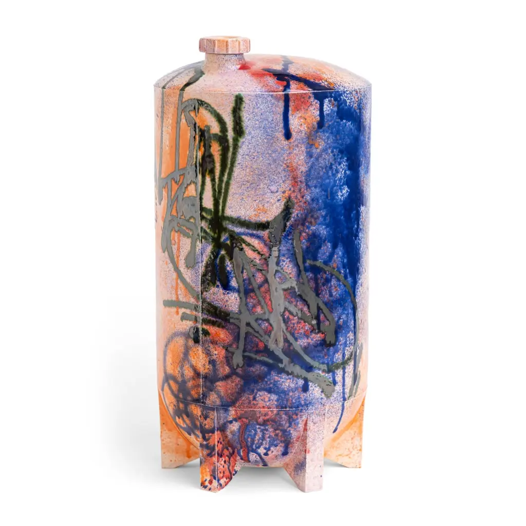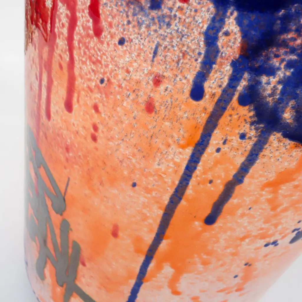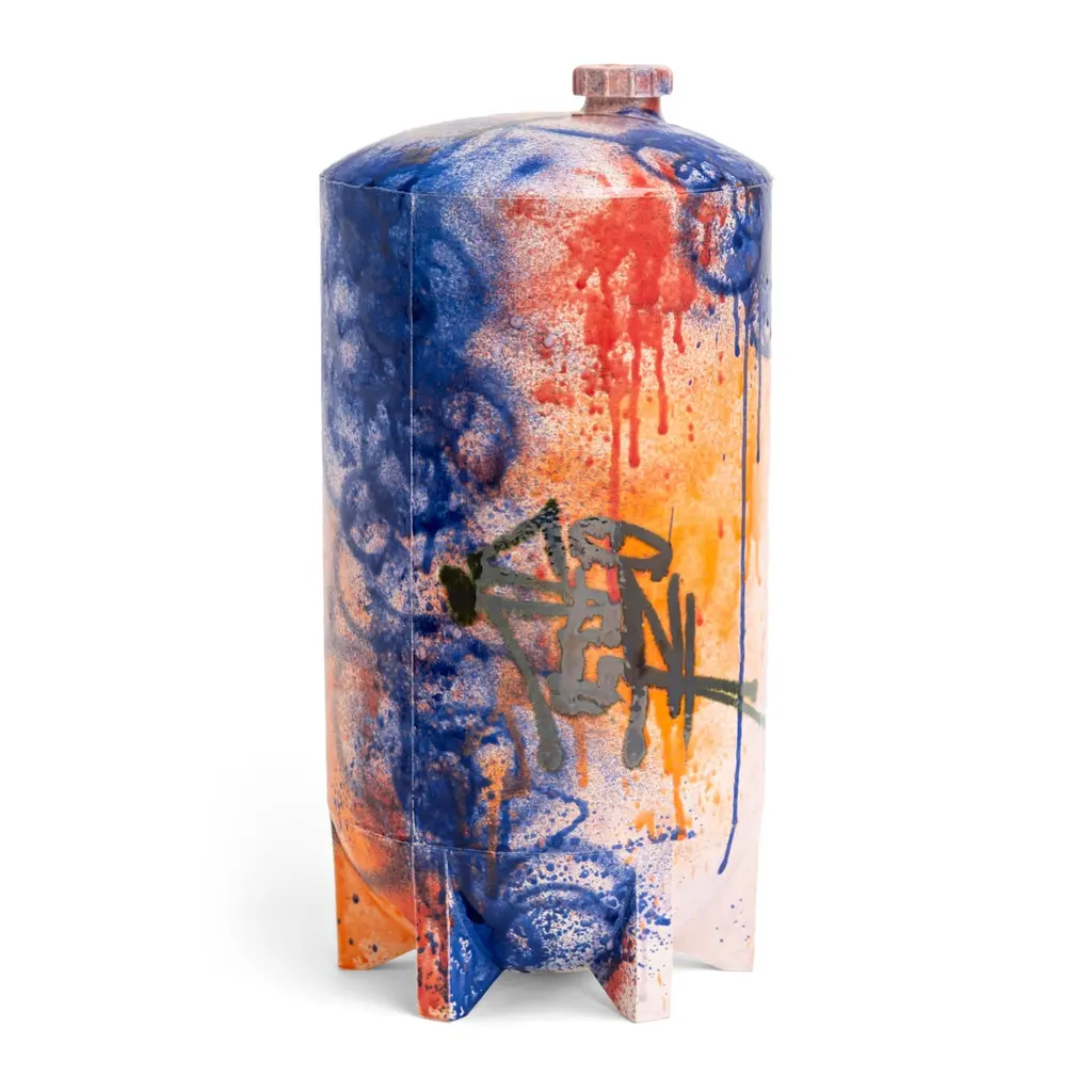 Under Pressure 7 by Yuri van Poppel.Dimensions: D 27 x H 55 cm.One of a kind.Material: earthenware, layered ceramic glazes, various colours.Handmade and spray-painted by hand by SunkOne. Removable lid.Everlasting graffiti spray-painted with ceramic glaze.Under Pressure pays homage to the rich history and culture of graffitiwriting, referencing both a writer’s tools and targets at the same time.From the cap of the first marker used to get up, to the fire extinguisherused for getting up higher.An echo of structures and machinery, industrial wastelands in the orangenight light. Powerful memories and sensations poured into a robust ob-ject -and a refined work of art. A unique handmade earthenware object,spray-painted by hand in various layers of ceramic glaze.Glazed Graffiti explores the aesthetic value of vandalism. A post-graffitiproject by SunkOne, aiming to eternize graffiti-writing by trespassing intoa new artistic medium.Glazed Graffiti was born out of the desire to write graffiti that lasts forever.To make this shift from ephemeral to eternal, graffiti writer SunkOne hadto cross the boundaries of traditional street graffiti. By changing the con-text of street tagging he wants to further explore the aesthetics of whatis often labeled as vandalism. To him, the tactility, opacity and shine ofceramic glaze mirrored the mesmerizing appearance of wet paint and ink,so he set out to engineer a spray can that would enable him to paint withceramic glaze without losing what he loves most about graffiti: the rawenergy and the rudimentary lines. With these air pressurized spray canshe is free to move around ceramic objects and surfaces and capture thepowerful visual language of graffiti writing in imperishable works of art.About SunkOneSunkOne (Yuri van Poppel, 1975) is a Dutch designer, contemporary artistand graffiti writer. Since drawing was his way to express himself as a child,he was instantly hooked when graffiti came from New York to Europe inthe mid-eighties. Seeing his name up written in stylized letters was anextremely powerful feeling to him at that age -and it still is. After studyingart history and design in the UK and The Netherlands, he worked in designand advertising winning multiple awards for his creative work.Simultaneously he participated in various national and internationalprojects and exhibitions with his graffiti work. With Glazed Graffiti,he is the first ever to spray ceramic glazes using custom built spray cans,capturing the raw energy of street writing in a new artistic medium.