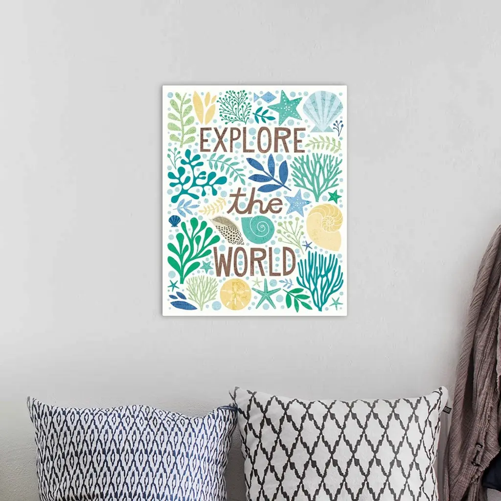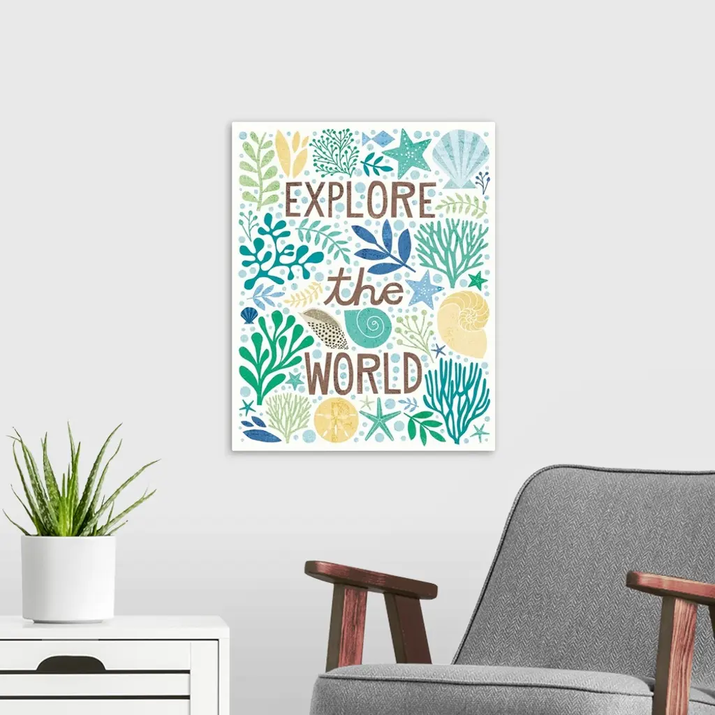 Beach themed illustration with seashells, coral, starfish, and various saltwater plants.