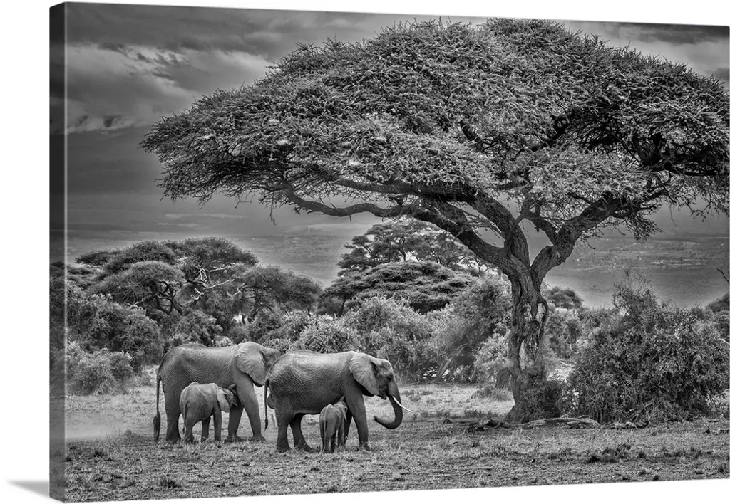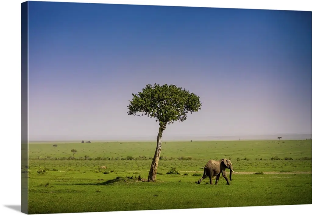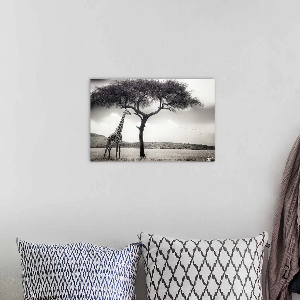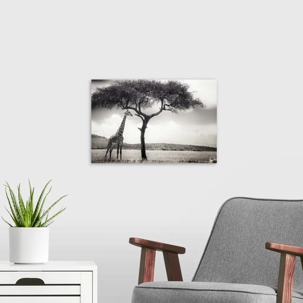 A giraffe stands in the shade of a tree in Kenya, with a lioness in the grass nearby.