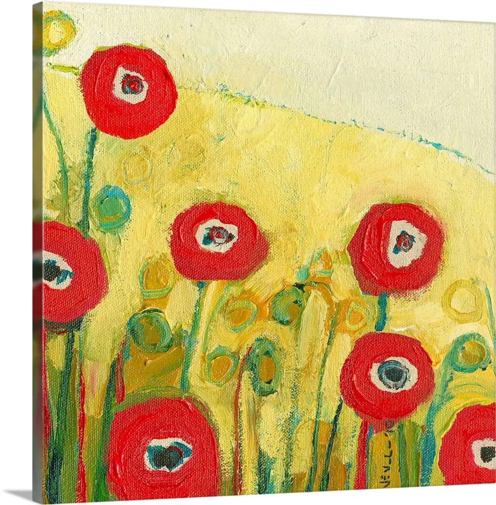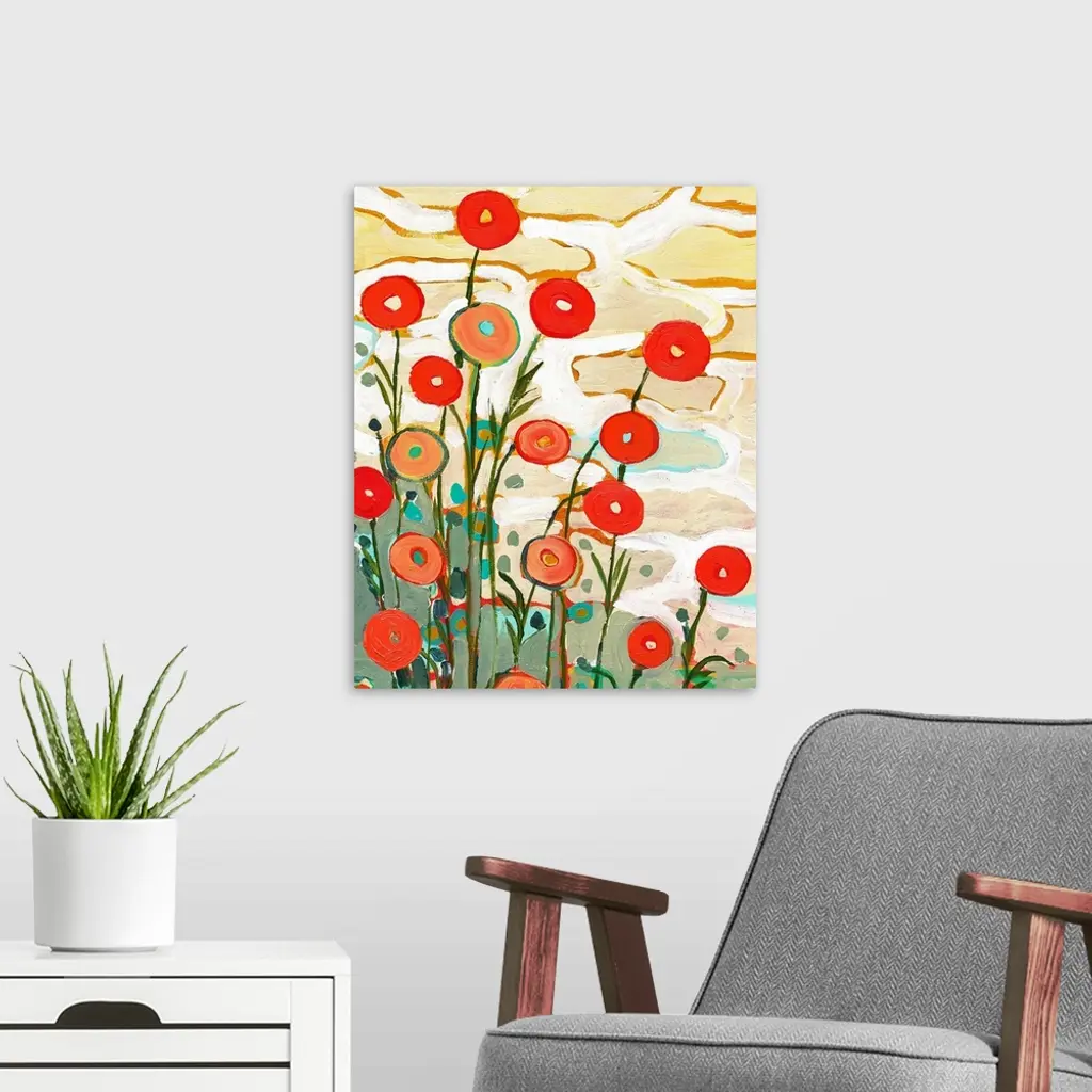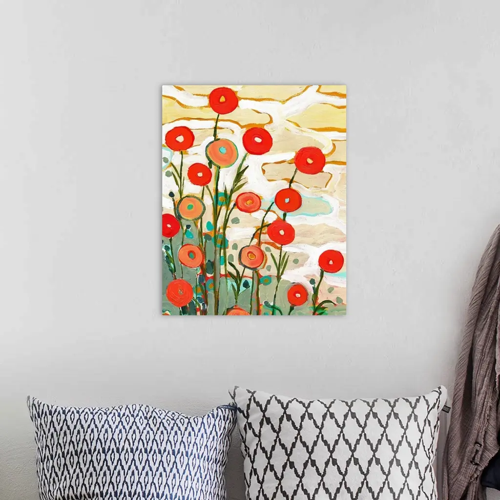 Giant contemporary art depicts an assortment of poppy flowers constructed of lots of circles and vertical lines enjoying a sunny day.