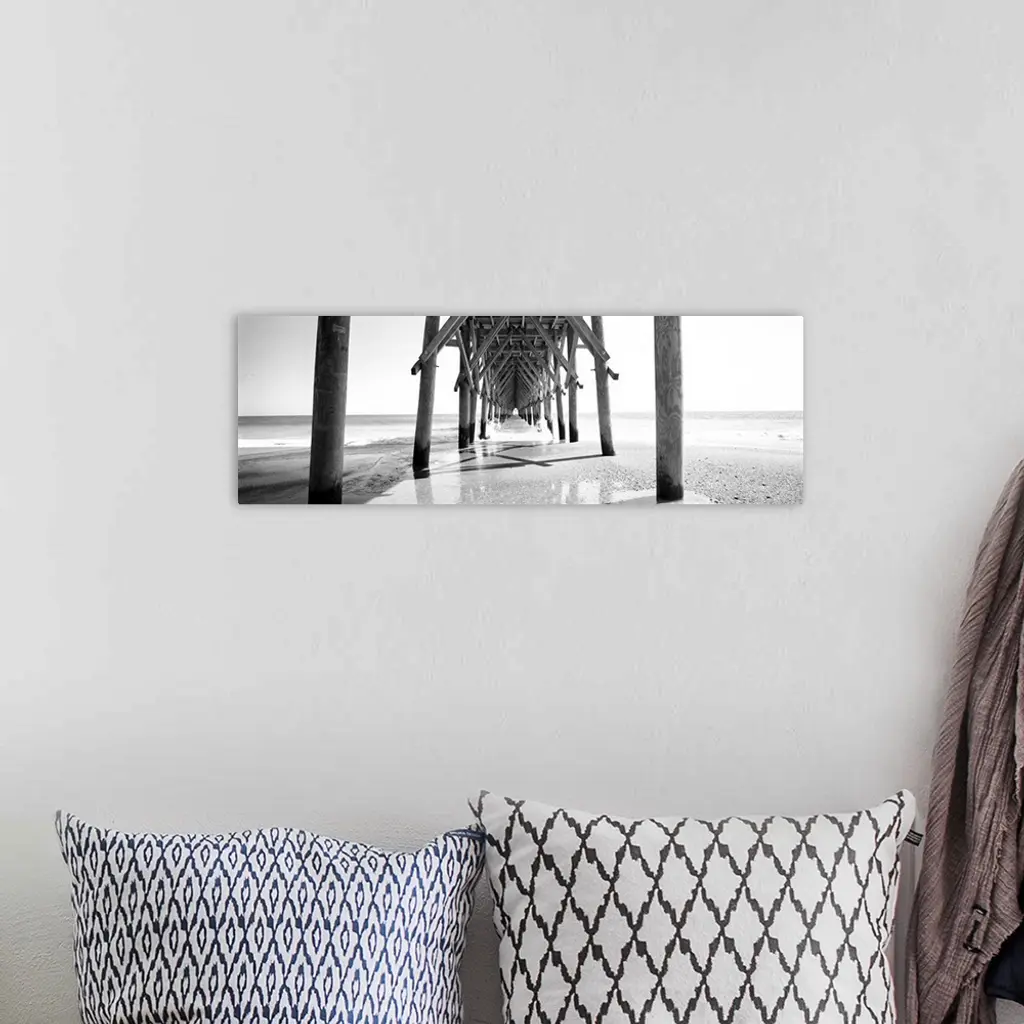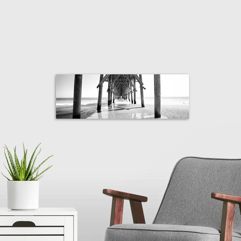 Horizontal, huge, black and white panoramic photograph taken under a wooden pier, looking out toward the ocean, in North Carolina.