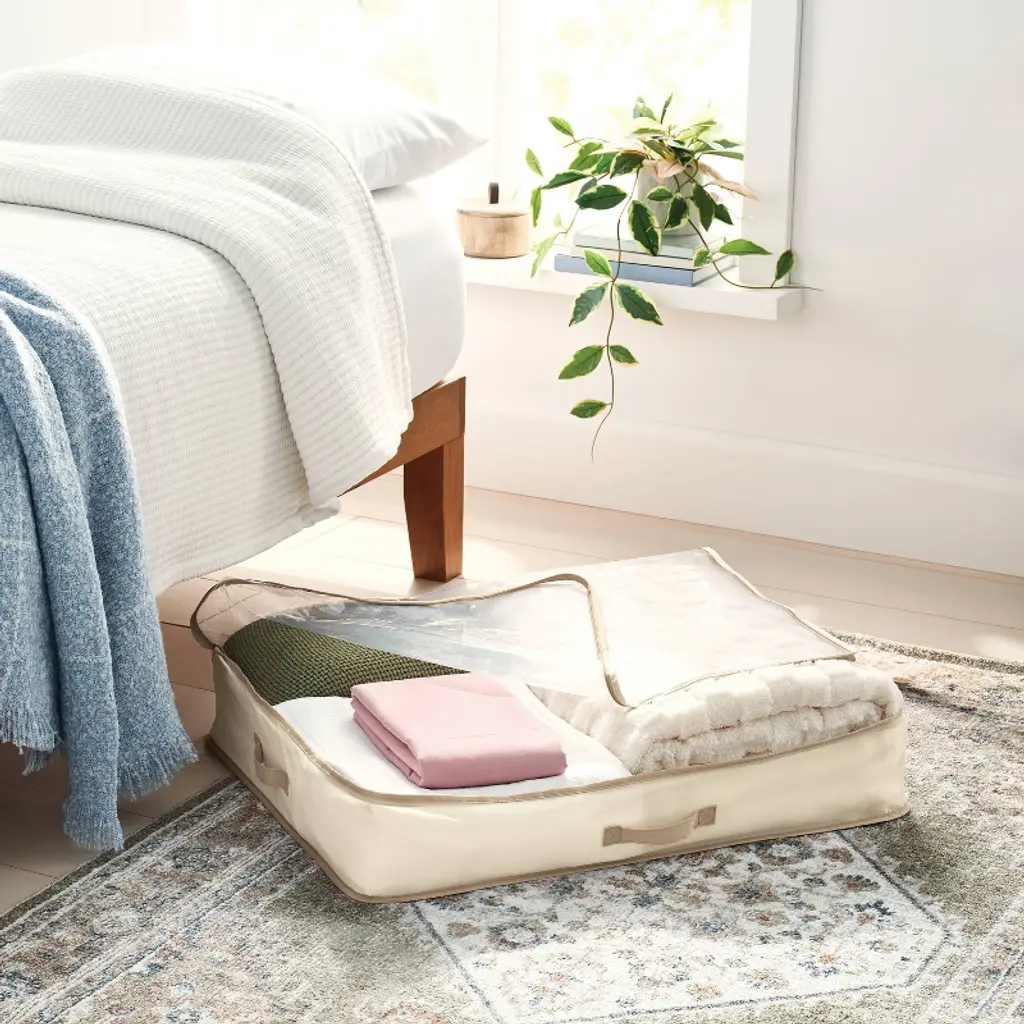 Store clothing, bedding and other essentials under the bed with the Underbed Storage from Brightroom™. This tan storage features a clear top to help you easily see the contents. It's made of plastic and has a zipper closure to help keep the contents nicely contained, while the side handles make it easy to move. Brightroom™: See your space in a new light.
