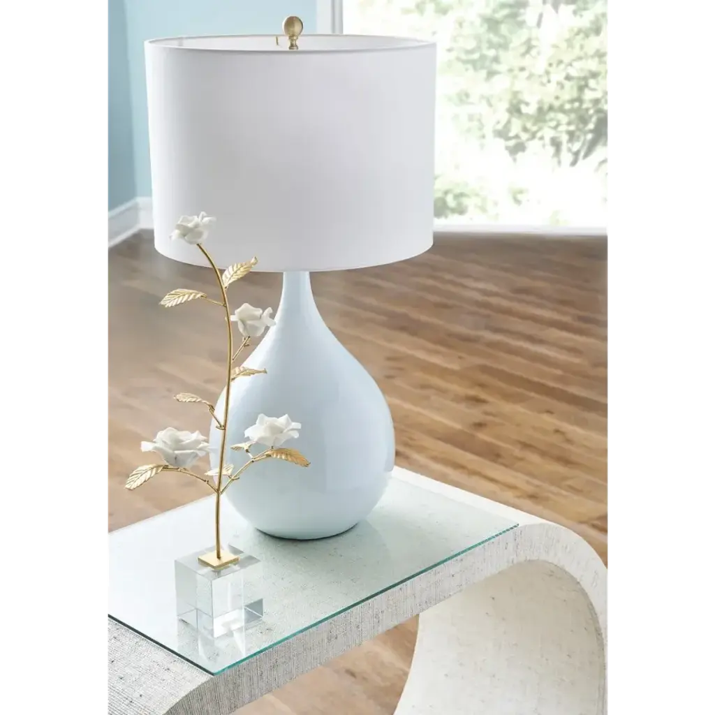 The modest shape of the Underhill Lamp perfectly complements its surroundings, adding simplicity with its blue ceramic glaze finish, brass details and a classic white shade. Designed by Bill Cain.