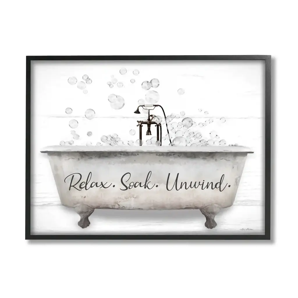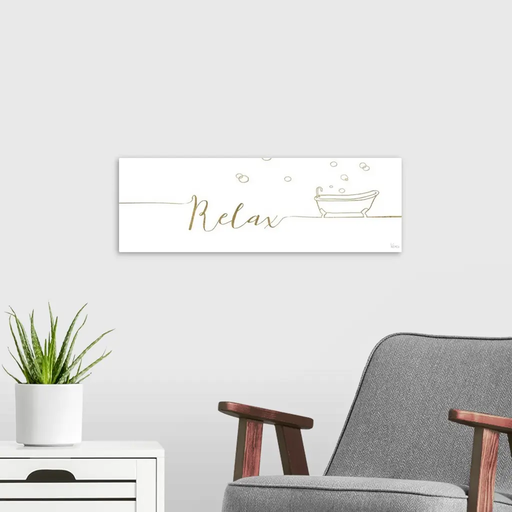 White and gold bathroom decor with the word "Relax" written on the side, an illustration of a bathtub, and floating bubbles all around.