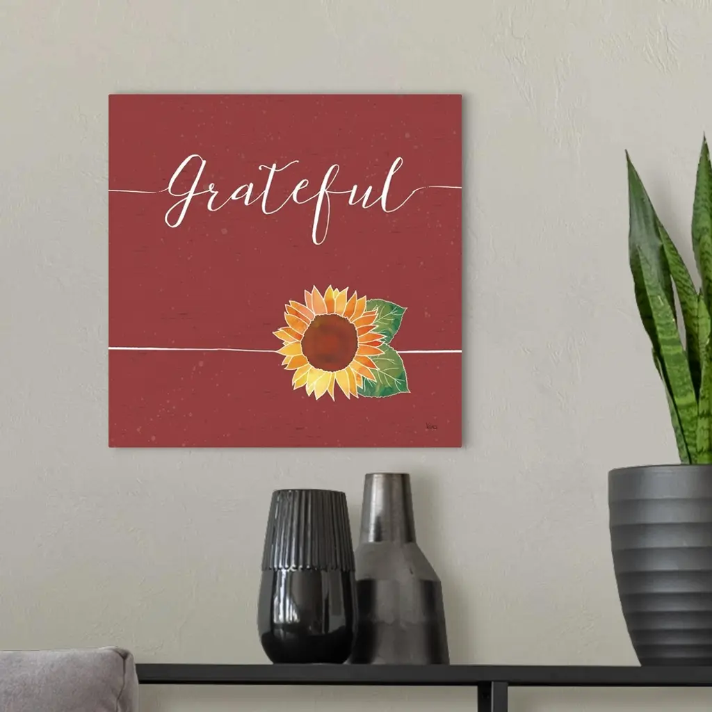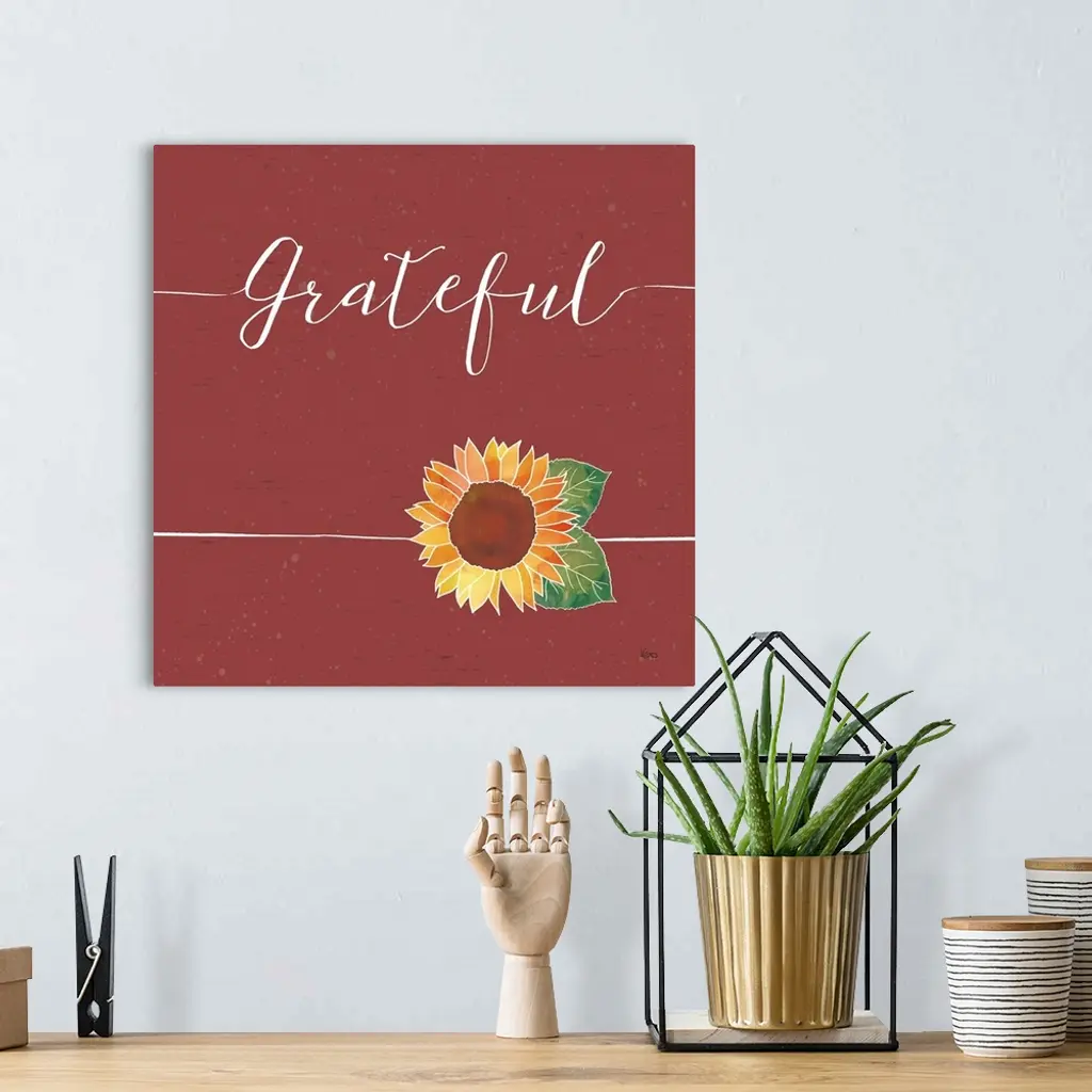 "Gratetful" with a sunflower on a wood textured red background.