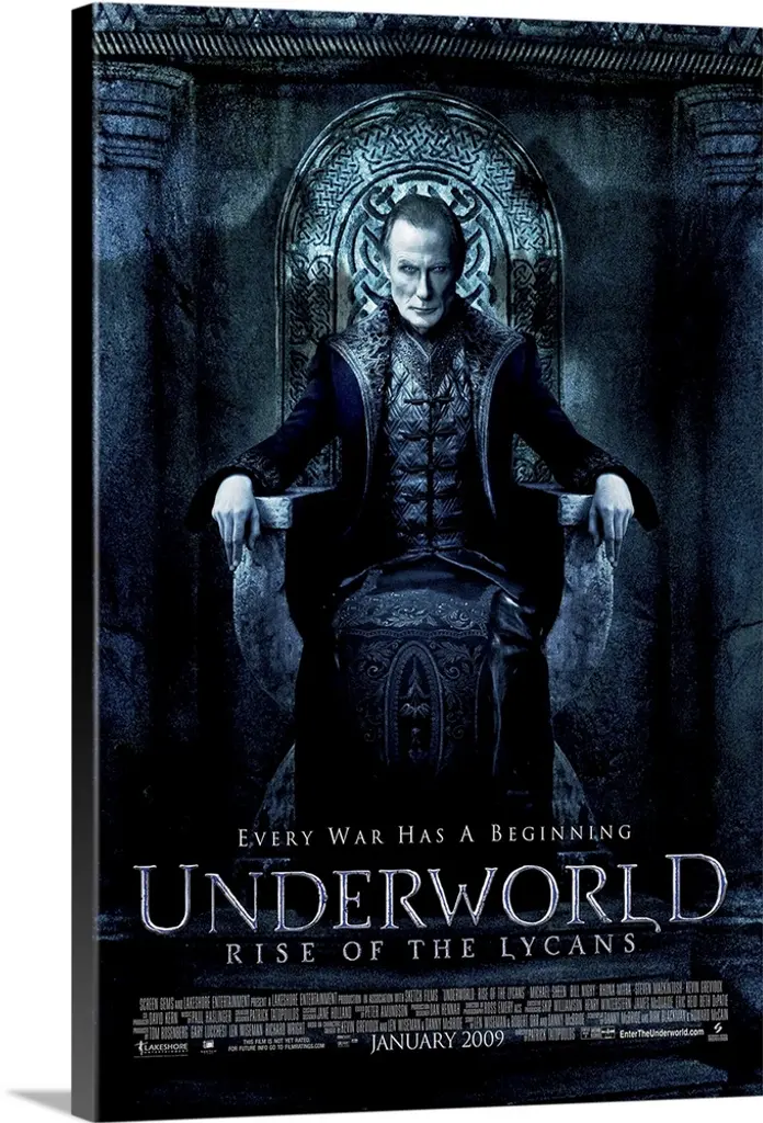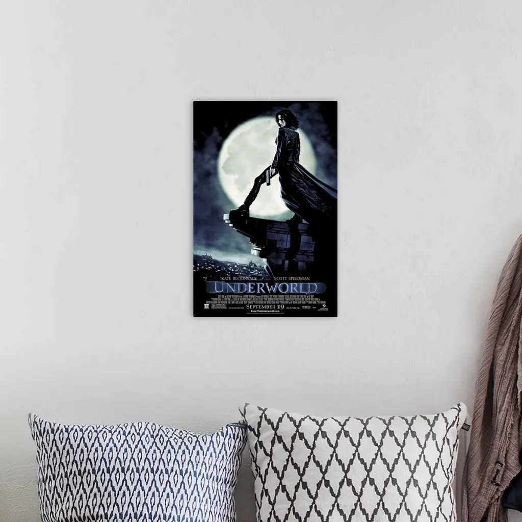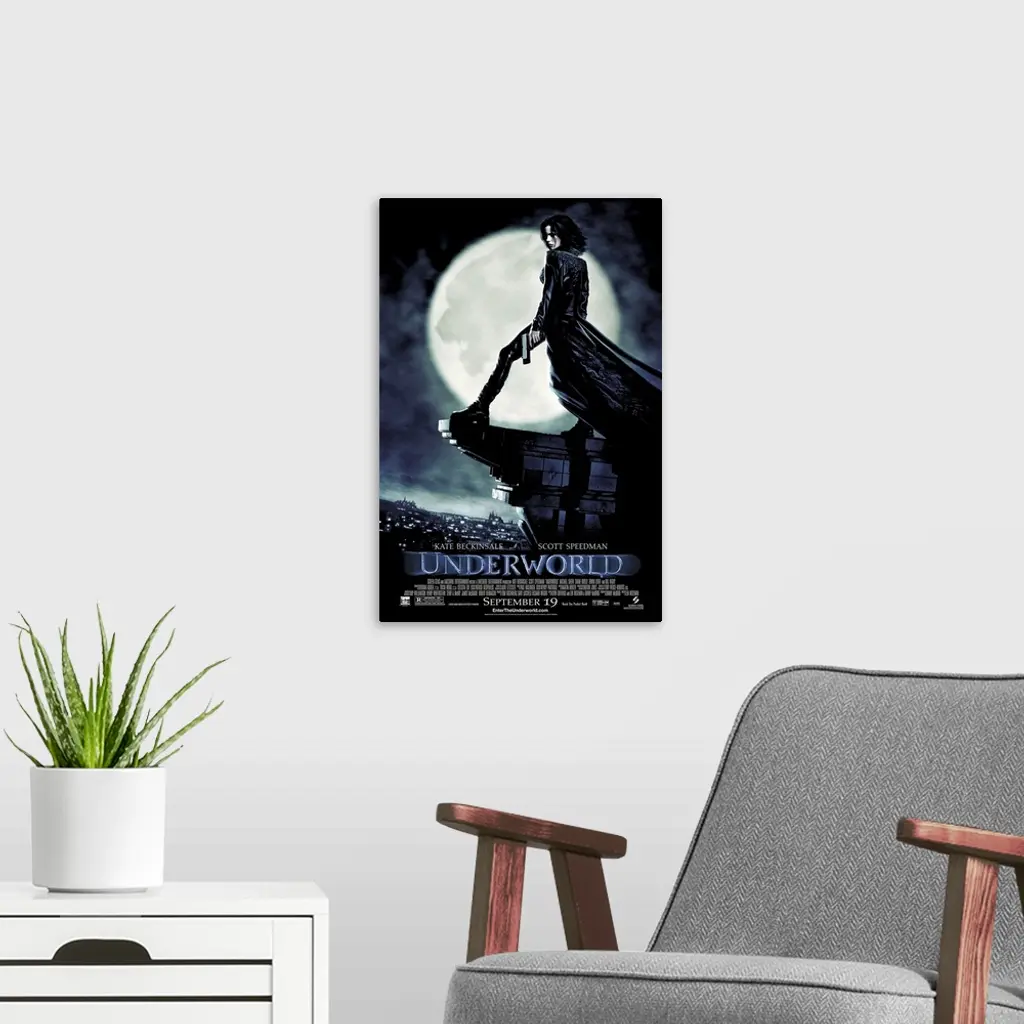 Large, vertical movie advertisement for Underworld, main character Selene stands with a gun in her hand, on the edge of the top of a building, against a large moon, overlooking the lit city at night. The shadow of a beast resides in the surface of the moon. Movie title and credits are at the bottom of the image.