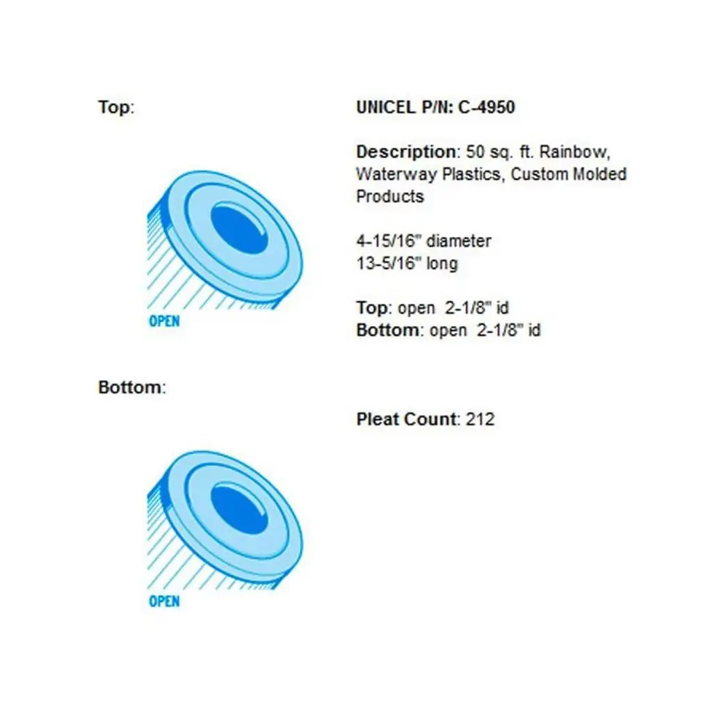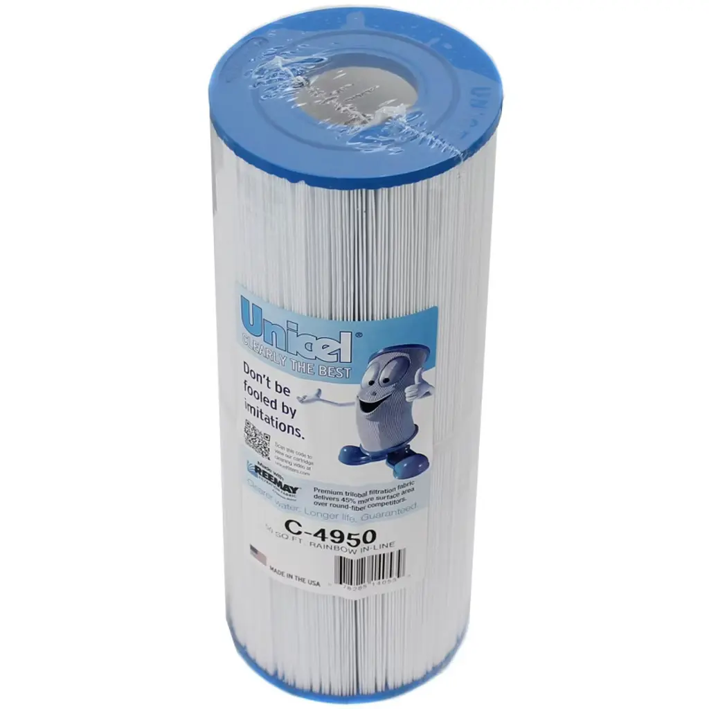 Shake off the summer heat in a cool pool. Make a splash in the cleanest swimming pool in the neighborhood with this Unicel C-4950 Replacement Filter Cartridges. Featuring 50 square feet of 3-ounce basis weight media made of 100-percent polyester Reemay material, each pool and spa cartridge filter ensures high performance and dependable filtration over time. The uniform pleats and Reemay media deliver higher dirt-holding capacity and more time between cleanings. Plus, the smooth surface of the media makes it easy to maintain, resists degradation from chemicals, stands strong under pressure, and holds up to the rigors of multiple cleanings. For optimal lifespan, clean the elements as per instructions and use a soft brush cleaning tool or filter cleaner for easy maintenance. Please note that the cartridge life depends on routine maintenance and pool or spa water chemistry. Change your filter when there is a shorter cycle between cleaning, low water flow rate or high differential pressure, when the media has a tear, or if the center core collapses. The end caps are made of durable plastic that resists damage from chemicals and include a 2-1/8-inch ID and open configuration for easy removal and replacement. This C-4950 model of pool filters is compatible with various swimming pools and hot tubs including Bullfrog Spas, Cal Spas, Coleman Spas, Dynasty Spas, Pentair Pool Products, Rainbow Plastics, Sundance Spas, Sunrise Spas, Waterway Plastics, Custom Molded Products, Beachcomber, Artesian Spas, Jacuzzi Premium, Maax Spas of AZ, Caldera Spas, and more. This Unicel C-4950 Cartridge Pool Filters is clearly the optimal choice to keep your hot tub or swimming pool water sparkling.