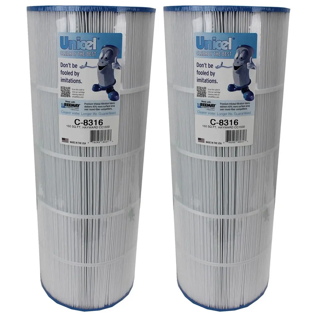 A backyard pool or hot tub can add an element of luxury to your home and offer a private place to relax away from the stressful things in life. But pulling off the cover and seeing dirty water can quickly turn your calm headspace into another headache. Avoid all the hard parts of owning a backyard spa by replacing your filter with a Replacement Pool Filter Cartridge from Unicel. Offering a longer life than most replacement filter cartridges, the Unicel filters are built to last using a durable filter media from Reemay, constructed of high-density polyester that has been spunbound to with less wasted filtering area. With a quality construction and tight seals around each of the 215 pleats, this filter cartridge allows for more clean and clear water to pass through, thanks to sharp and rigid pleat fold around the entirety of its 8-inch diameter body. The tough urethane end caps assure durability throughout the lifetime of the cartridge, helping it stand up to any sort of debris that works its way into the filter. This filter is a recommended replacement for the Hayward XStream CC1500 filters. With the capability to clean an area as large as 150-square-feet, this Unicel Filter Cartridge is a dependable solution for any small pool, hot tub, or residential spa. Plunge into your pool not your pockets by choosing the high-quality filter accessories from Unicel for the long-term filtering of your backyard oasis. Replacement C-8316 pool filter cartridge ensures your water stays clear so you can enjoy relaxing in your swimming pool Features 150 square feet (215 pleats) of 3-ounce basis weight media that catches debris and particles down to an average of 20 microns in size Sharp, uniform pleat folds maximize water flow, minimize pressure loss, and allow full use of the pleat surface to hold more debris Constructed with 100-percent polyester Reemay material that balances dirt-holding capacity, cleanability, and durability with excellent chemical resistance properties End cap design includes a 4-inch ID and an open configuration (with molded gasket) for easy cartridge removal and replacement Durable end caps resist damage from chemicals and assure durability for the life of the cartridge Compatible with Hayward Pool Products Filter life depends on routine maintenance of water chemistry Change filter when there is a shorter cycle between cleaning, low water flow rate or high differential pressure, when the media has a tear, or if the center core collapses Media material: Spun-bonded polyester End cap material: Plastic Top/Bottom end cap ID: 4 inches OD: 8-15/16 inches Length: 23-5/16 inches Overall dimensions (L x W x H): 8.94 x 8.94 x 23.31 inches