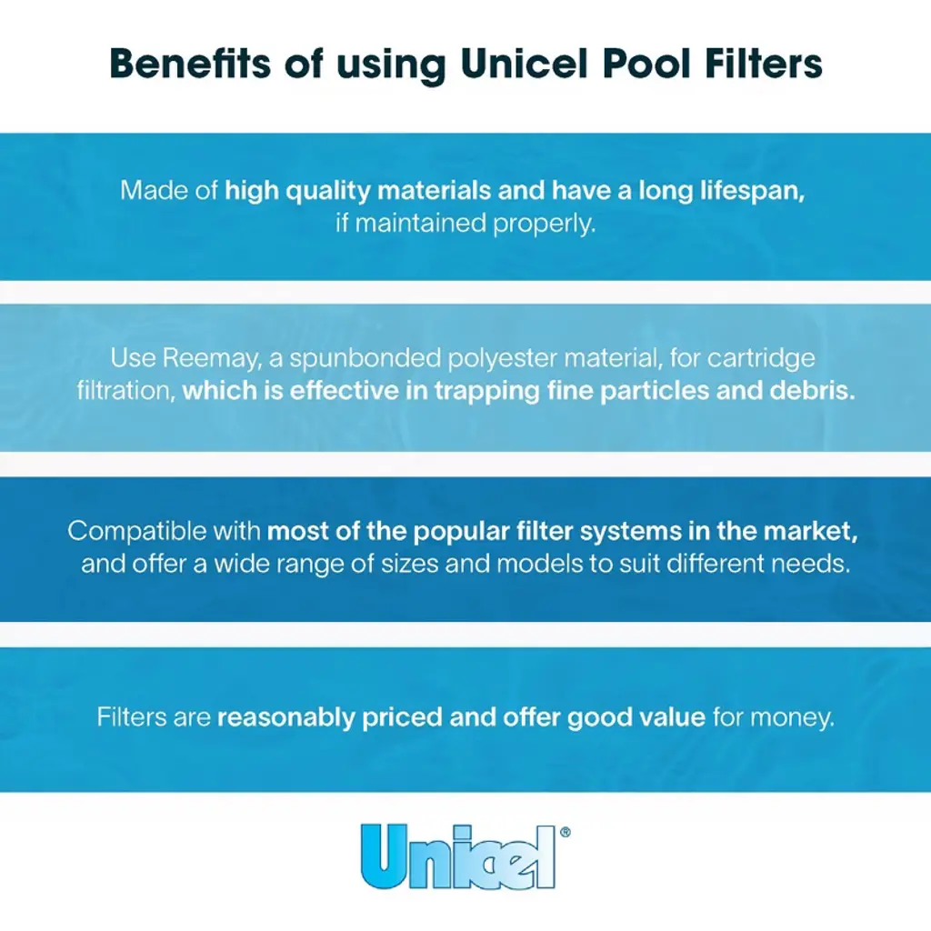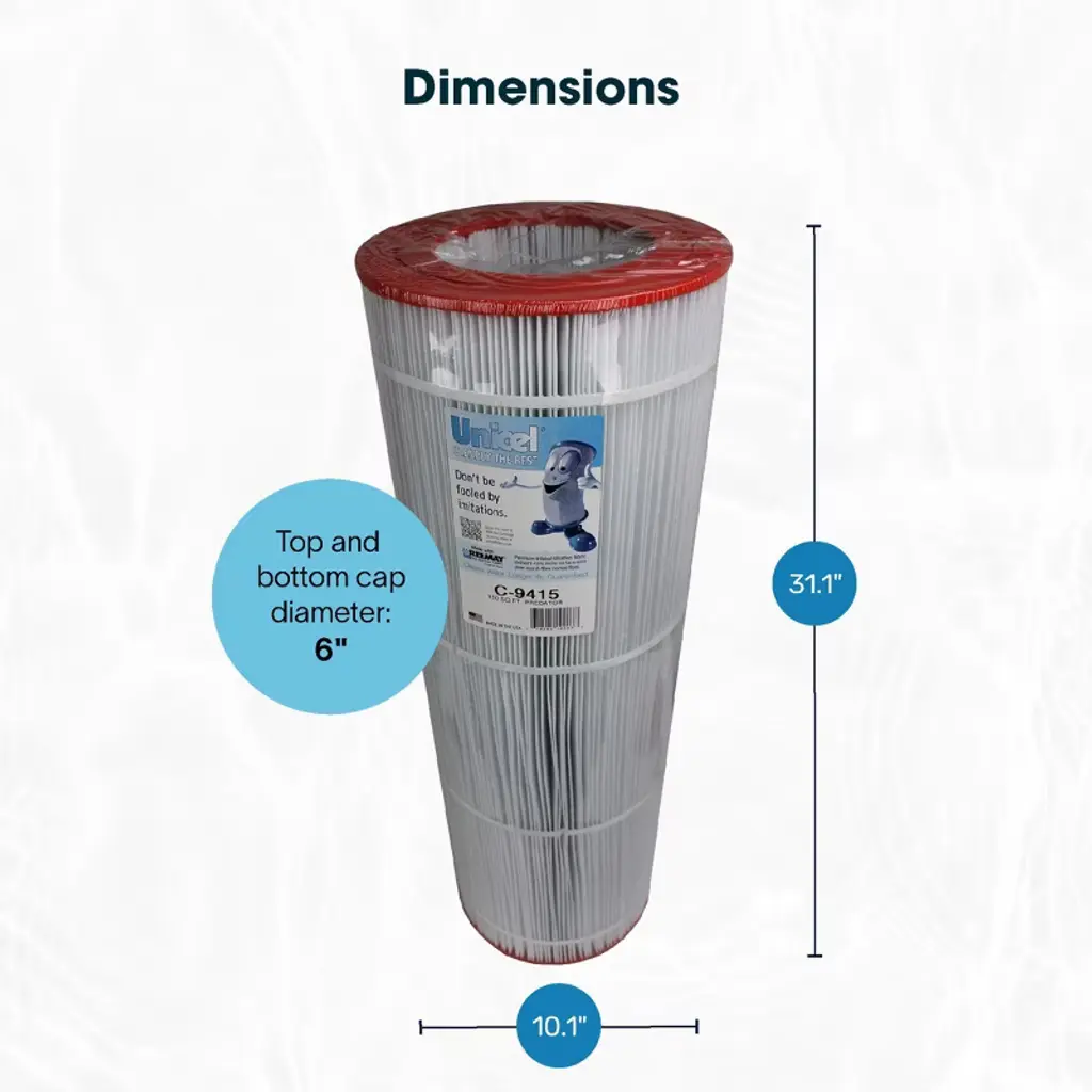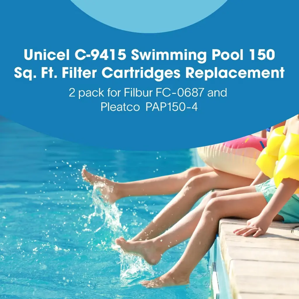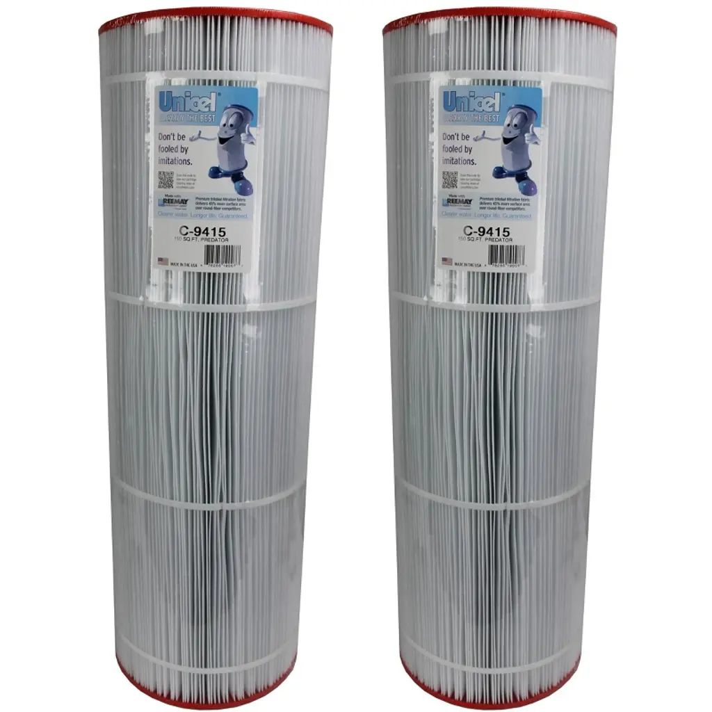 Shake off the summer heat in a cool pool. Make a splash in the cleanest swimming pool in the neighborhood with Unicel C-9415 Replacement Filter Cartridge. Featuring 150 square feet of 4-ounce basis weight media made of 100-percent polyester Reemay material, this pool cartridge filter ensures high performance and dependable filtration over time. The uniform pleats and Reemay media deliver higher dirt-holding capacity and more time between cleanings. Plus, the smooth surface of the media makes it easy to maintain, resists degradation from chemicals, stands strong under pressure, and holds up to the rigors of multiple cleanings. For optimal lifespan, clean the elements as per instructions and use a soft brush cleaning tool or filter cleaner for easy maintenance. Please note that the cartridge life depends on routine maintenance and pool water chemistry. Change your filter when there is a shorter cycle between cleaning, low water flow rate or high differential pressure, when the media has a tear, or if the center core collapses. The end caps are made of durable plastic that resists damage from chemicals and include a 6-inch ID and open configuration for easy removal and replacement. This C-9415 model of pool filters is compatible with Pentair Pool Products, American Products, Pac Fab, and Sta-Rite. The Unicel C-9415 Cartridge Pool Filter is clearly the optimal choice to keep your swimming pool water sparkling.