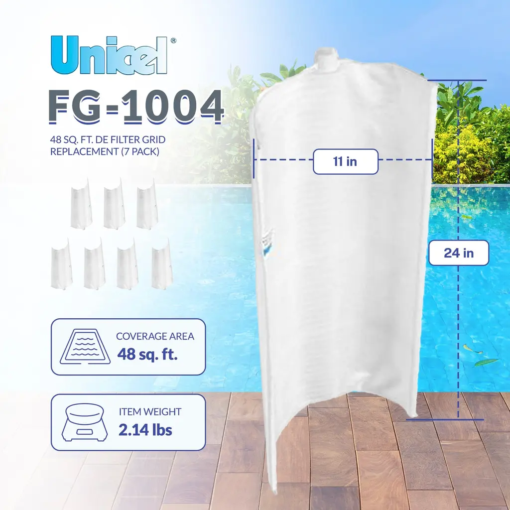 Enjoy your time in the water and get the ultimate pool maintenance solution with this 7-pack of Unicel FG-1004 DE Grid Replacements. Each grid is engineered with fabric that is constructed with a high yarn count of fine denier fiber which yields an optimal permeability to ensure maximum efficiency and durability. Use the grids with DE powder for pool filter applications to trap dirt and debris down to an average of 2 to 5 microns. What's more, the filter media ensures less resistance to water flow, longer cycles between backwashes, and great DE caking properties for efficient debris and particle capture. Compatible with 48-square-foot systems manufactured by Hayward Pool Products, Pentair Pool Products, American Products, Pac Fab, Sta-Rite, Astral, Waterway Plastics, Jacuzzi, and Jandy, these grids can be used as an in ground or above ground pool filter. Please note that each filter measures 24 inches long and 11 inches wide. To replace the entire set, 8 grids are needed. This 7-pack of Unicel FG-1004 DE Grid Replacements is the clear choice to keep your swimming pool water sparkling. Why Unicel? For over 50 years, Unicel has been developing and manufacturing elements for both the pool and spa OEM market and the wholesale distribution trade. With quality components and 50+ years of experience operating and sourcing in the USA, Unicel is recognized as the industry leader. Pack of 7 replacement FG-1004 DE grids features media with a high yarn count of fine denier fibers, which yield an optimal permeability to keep your water sparkling Grid cloth design allows for better DE caking properties and less resistance to water flow for optimal performance; Longer cycles between backwashes for convenience Filter grid and diatomaceous earth powder paired together efficiently filter out debris and impurities down to an average of 2 to 5 microns Compatible with 48-square-foot systems manufactured by Hayward Pool Products, Pentair Pool Products, American Products, Pac Fab, Sta-Rite, Astral, Waterway Plastics, Jacuzzi, and Jandy Includes 7 grids; To replace the entire set, 8 grids are needed Suitable for in-ground pools and above-ground pools Material: Woven polypropylene Dimensions (L x W): 24 x 11 inches Quantity: 7