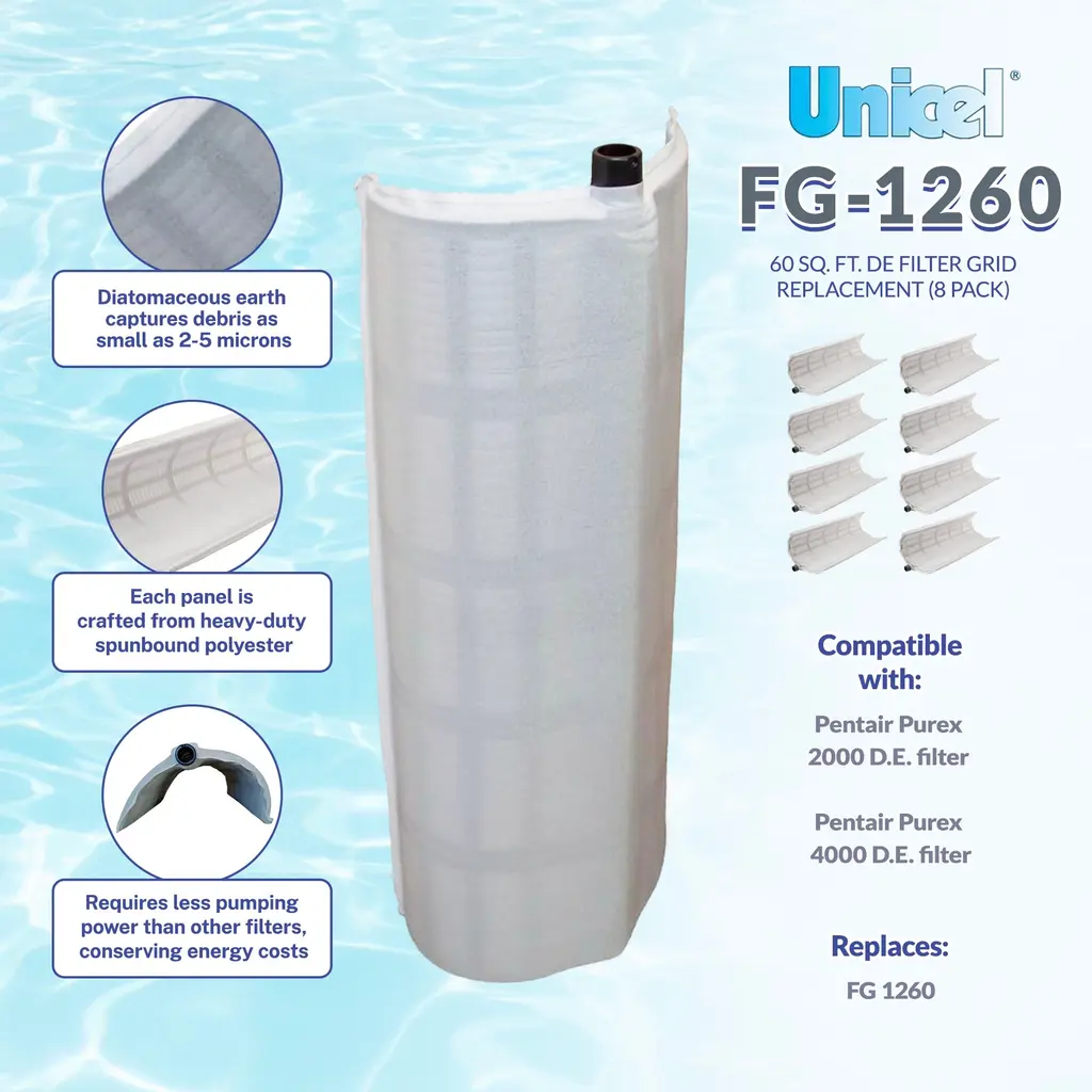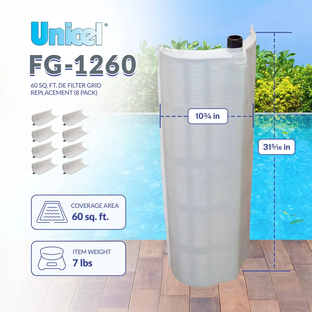 Enjoy your time in the water and get the ultimate pool maintenance solution with this 8-pack of Unicel FG-1260 Single DE Grid Replacements. Each grid is engineered with fabric that is constructed with a high yarn count of fine denier fiber which yields an optimal permeability to ensure maximum efficiency and durability. Use the grids with DE powder for pool filter applications to trap dirt and debris down to an average of 2 to 5 microns. What's more, the filter media ensures less resistance to water flow, longer cycles between backwashes, and great DE caking properties for efficient debris and particle capture. Compatible with 60-square-foot systems manufactured by Purex, these grids can be used as an in-ground swimming pool filters or above-ground swimming pool filters. Please note that this is 8 of the FG-1260 filters. This 8-pack of Unicel FG-1260 DE Grid Replacements is the clear choice to keep your swimming pool water sparkling. Why Unicel? For over 50 years, Unicel has been developing and manufacturing elements for both the pool and spa OEM market and the wholesale distribution trade. With quality components and 50+ years of experience operating and sourcing in the USA, Unicel is recognized as the industry leader. Pack of 8 replacement FG-1260 DE grids features media with a high yarn count of fine denier fibers, which yield an optimal permeability to keep your water sparkling Grid cloth design allows for better DE caking properties and less resistance to water flow for optimal performance; Longer cycles between backwashes for convenience Filter grid and diatomaceous earth powder paired together efficiently filter out debris and impurities down to an average of 2 to 5 microns Compatible with 60-square-foot systems manufactured by Purex Includes 8 grids Suitable for in-ground pools and above-ground pools Material: Woven polypropylene Length: 31-5/16 inches Width: 10-3/4 inches Dimensions (L x W): 31.31 x 10.75 inches Quantity: 8