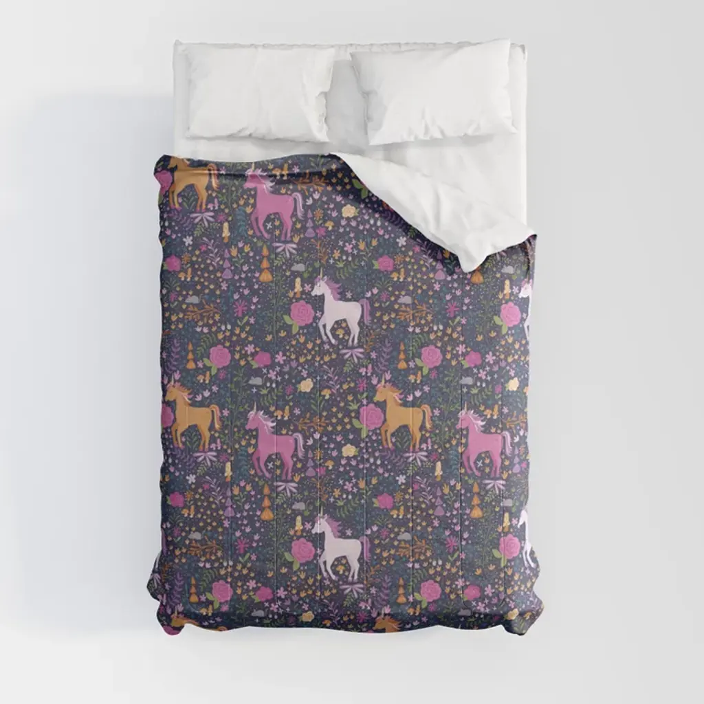 Unicorns On A Dark Background With A Fairy Forest Comforter