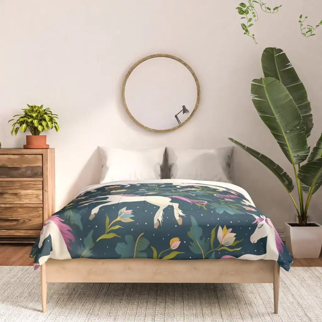 Unicorns On A Dark Background With A Fairy Forest Comforter
