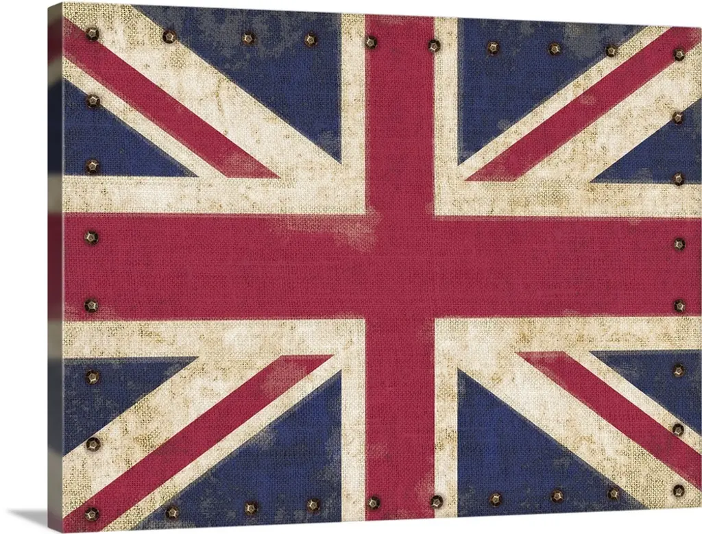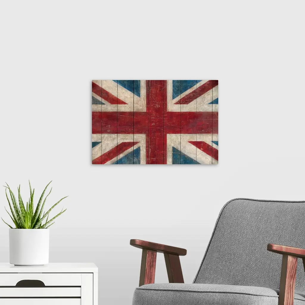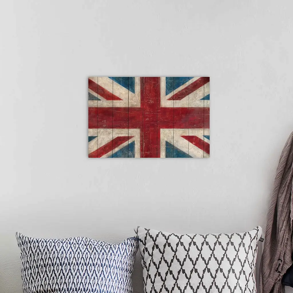 Decorative wall art of the national flag of the United Kingdom painted on wood panels that have a distressed and scratched texture.