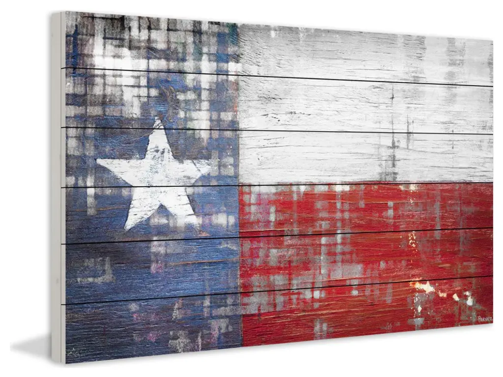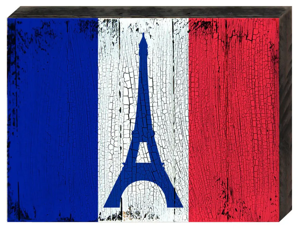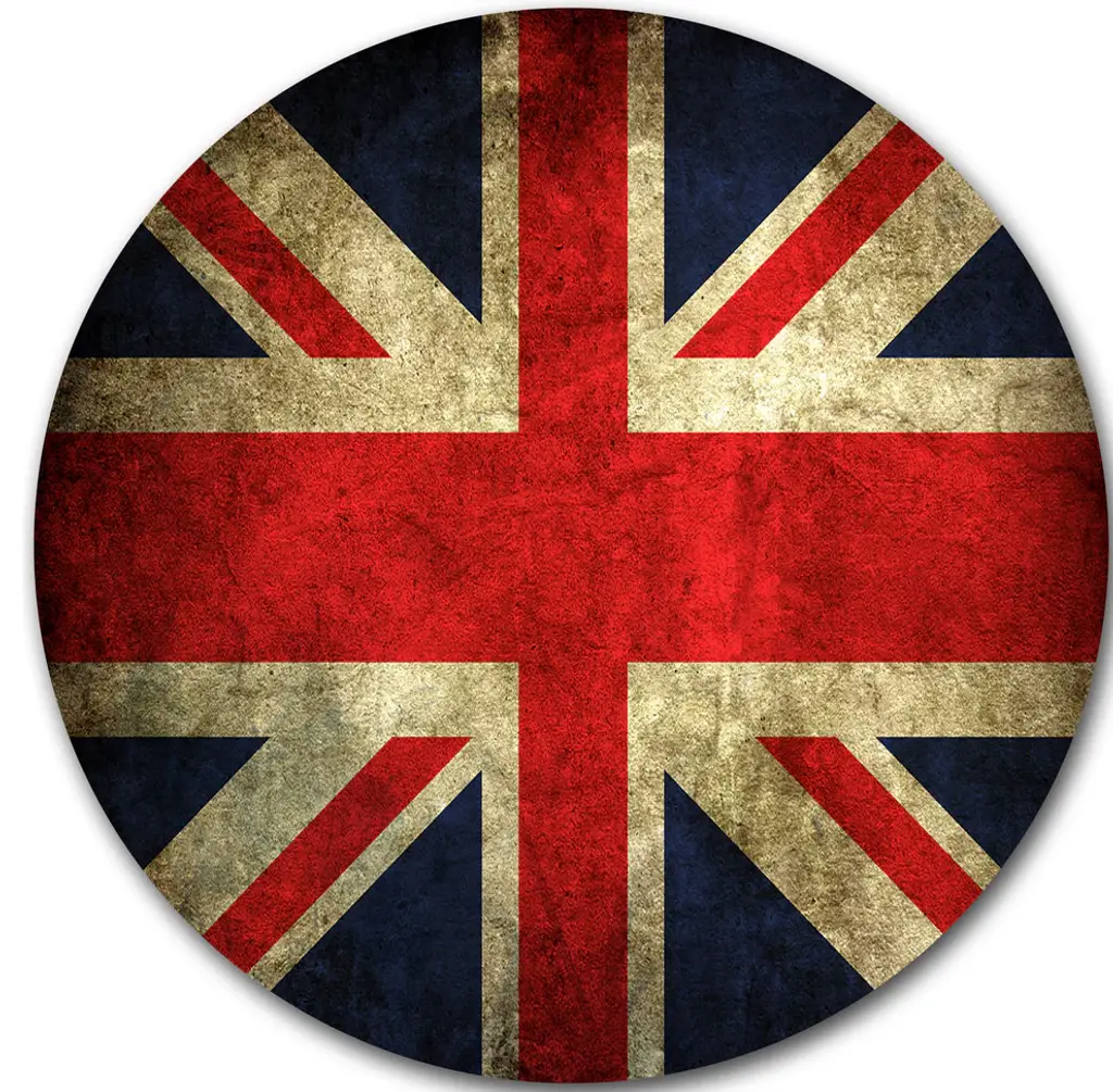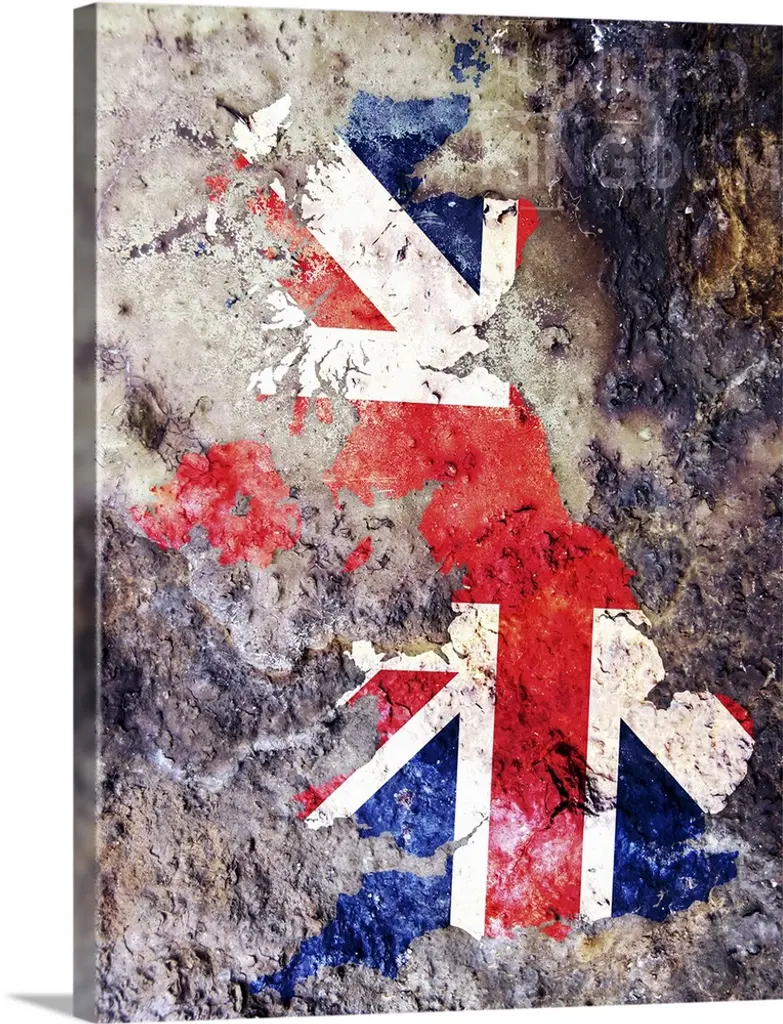Decorative wall art of the national flag of the United Kingdom painted on wood panels that have a distressed and scratched texture.