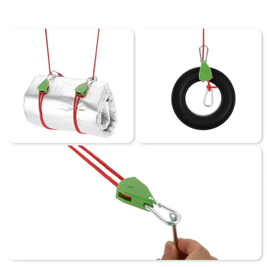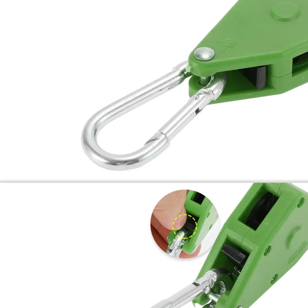 Item Function: 1. Made of quality plastic and galvanized iron, which is durable, not easy to break and has a long service time. 2. This rope hanger is lightweight and compact, therefore it is easy to carry and store, you can take it to whereever you like. 3. Fully adjustable, ratchets lock into place, with a safety grips design, you can use it to raise and lower fixtures as needed, making it easy to use. 4. It can be used as an adjustable rope hook or locking pulley, which is suitable for hanging grow light, tie down rope etc. Helps you to accomplish hard work. Specifications: Material: Plastic, Galvanized Iron; Screw Size: 3mm / 1/8"; Buckle Inner Diameter: 16mm / 0.63"; Overall Size: 9x3.3cm / 3.54"x1.3"(L*W); Package List: 6 Pcs Rope Hanger.