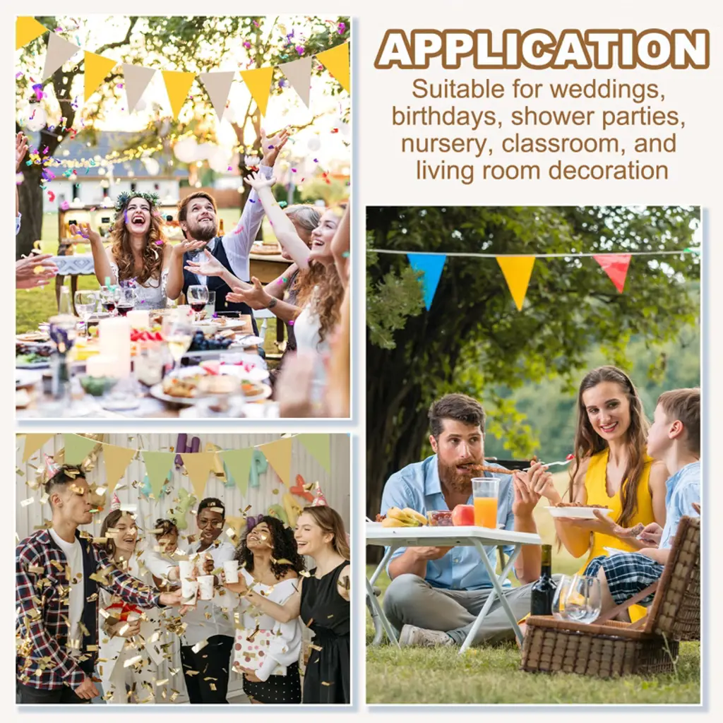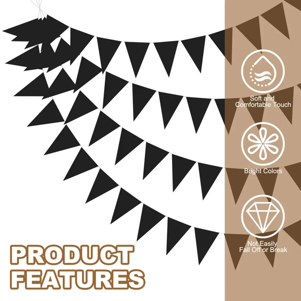 These pennant banner flags are crafted from felt fabric, offering a soft and comfortable touch. The precise pennant cutting ensures durability, making them wear-resistant and reusable. Perfect for both indoor and outdoor settings, these banners create an unforgettable visual experience for events such as weddings, birthdays, classrooms, living rooms, Halloween, Thanksgiving Day, carnivals, Easter parties, and Christmas decorations. The flags' quantity and banner distance can be adjusted, allowing you to hang them anywhere by simply tying a knot at the end of the string.