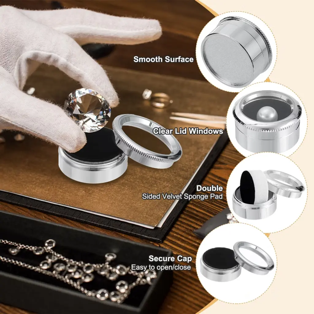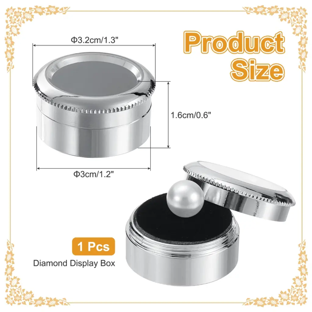 This jewelry/gemstone display box is suitable for various occasions, including home use, jewelry shops, trade shows, showrooms, retail stores, birthday parties, weddings, anniversaries, and celebrations. It's suitable for storing and displaying gems, bare stone, coins, rings, earrings, small necklaces, beads, pendants, and other delicate items. The gemstone display case is made of good-quality metal, acrylic, and double-sided flannel foam cushion, with clear acrylic lids for a luxurious touch, durable and sturdy, ensuring long-lasting use and protection for your valuable items. The transparent lid with an acrylic window allows for easy visual display of the contents, making it easier to find the desired piece of jewelry. Designed with a double-sided black and white velvet sponge pad, the jewelry container can better protect the diamond from wear and tear. The jewelry container is crafted with a smooth surface, rounded edges, and a fine manufacturing process, ensuring a comfortable touch and elegance. These diamond boxes are tight openings and closings, are easy to use, and convenient for collecting, storing, and shipping jewelry and other delicate items. Just twist the cap to open or close tightly. Please choose the right size to meet your storage or display needs. The gemstone is not included in the package.