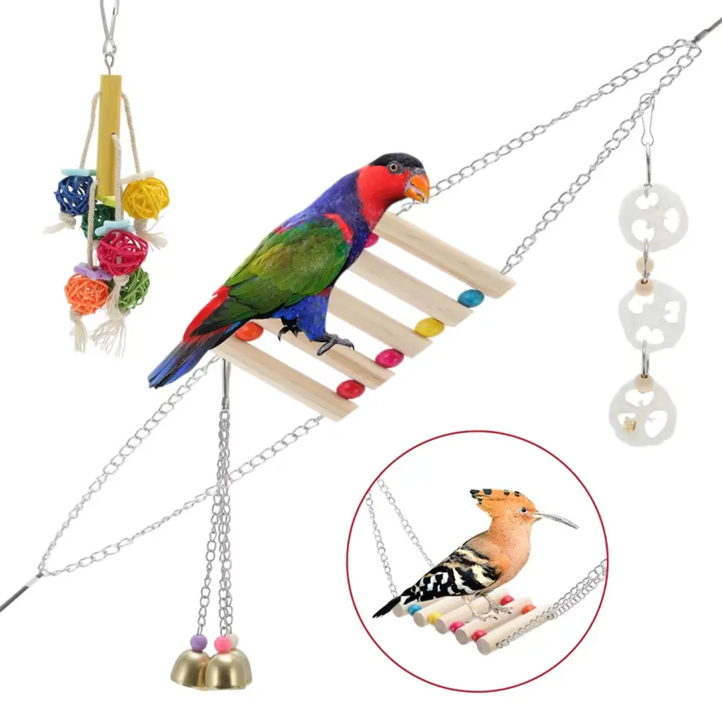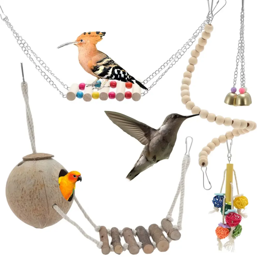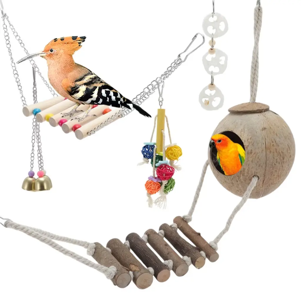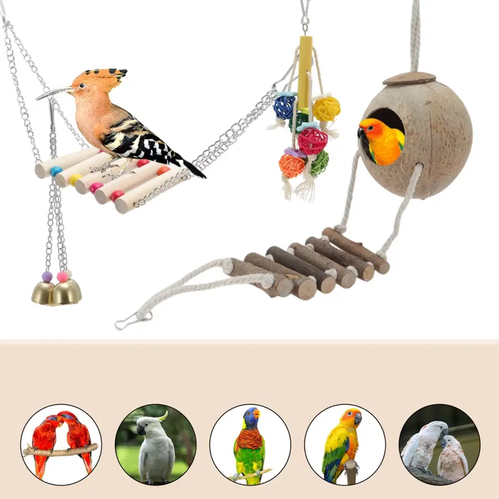 Features: Diverse bird toy set catering to chewing, climbing, playing, and resting.Crafted from natural materials with an enticing bell sound to captivate birds.Includes a coconut hideaway with a ladder for beak/feet exercise and shelter.Features a hanging hammock and beaded ladder for elevated areas. Specifically designed for small to medium birds to enhance vitality. Specification: Color: Brown, Material: Coconut Shells, Wooden Branches, Sisal Rope, Coconut Bridge Size: 66x6cm/ 25.98"x2.36"(L*D), Bridge Size: 19x11cm/ 7.48"x4.33"(L*W), Toy Size 1: 54cm/ 21.56", Toy Size 2: 26.5cm/ 10.43", Toy Size 3: 22.5cm/ 8.86", Toy Size 4: 27cm/ 10.63". Package List: Pcs Cockatiel Toys. Note: Ensure proper supervision when introducing new toys to your bird's habitat. Regularly inspect the toy for any signs of wear and tear, and replace it if necessary to ensure your bird's safety.