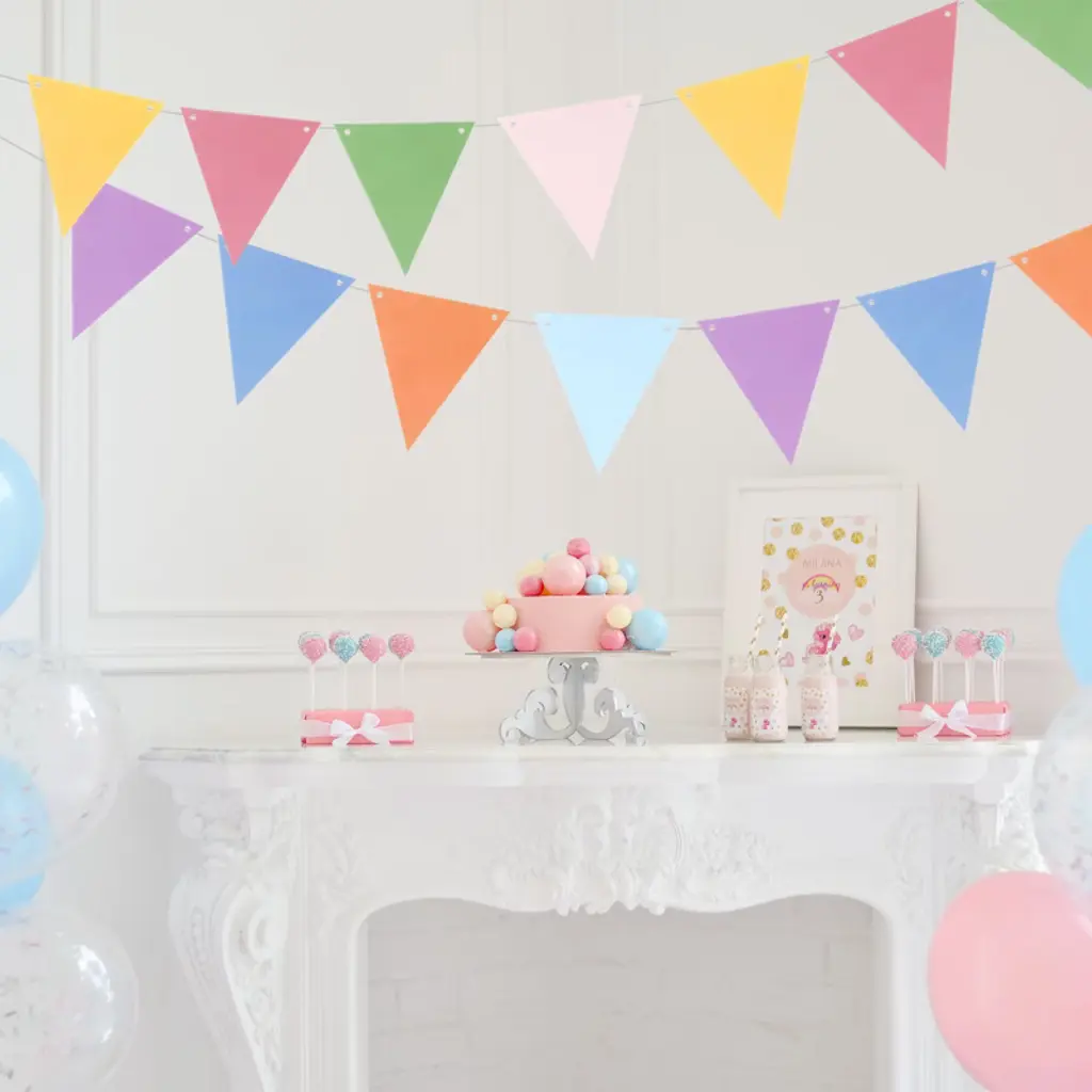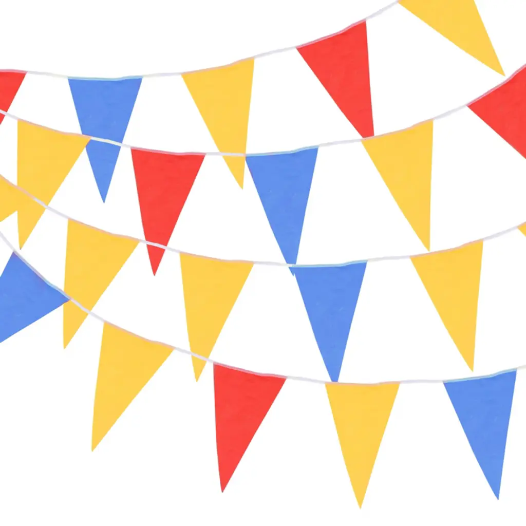This pennant banner is mainly used for party decoration. You can hang or stick these decorative ribbons on the wall, window, door, or shelf to add a different atmosphere to your party. It is mainly used for birthdays, weddings, Christmas, Easter, masquerades, graduation parties, and other parties. This pennant flag is made of card paper, durable and can be reused. After the party, just take it down and fold it back. The pennant banner flag string has a solid color banner, allowing you to DIY draw any pattern you want on the banner. These pennant flags are very convenient to use, and the rope is strong, ensuring it will not fall off easily even when hung outdoors. To use, unfold the triangle bunting flags, and then tie the ropes at both ends to a fixed position. Please confirm the length before you buy.