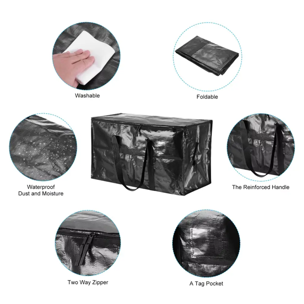 These extra-large moving bags are perfect for organizing and storing clothes. They are made of durable construction from PP and PE materials. The bags are odorless and washable, ensuring your clothes are kept dry and protected from dust and moisture. The reinforced handles provide extra strength, preventing tearing during use. Lightweight and foldable, these bags are easy to store when not in use, making them ideal for space-saving solutions. The two-way zipper allows for easy access while keeping dust out. Perfect for moving, camping, or holiday packing, these bags offer a versatile and practical storage solution.