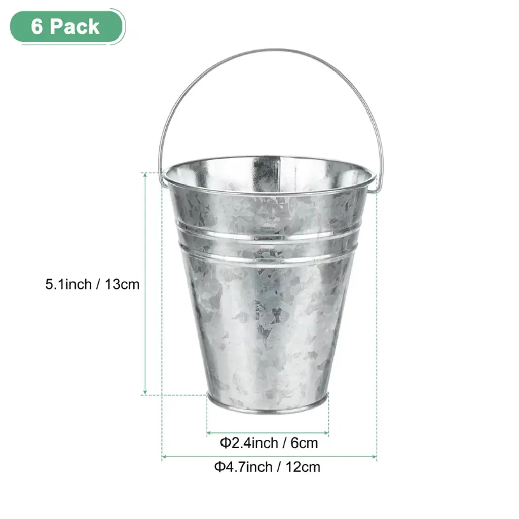 These small metal buckets with handles are versatile containers suitable for gardening, planting flowers, storing tools, and organizing small items. Made from galvanized iron, they are resistant to corrosion and offer longevity. The sturdy handle allows for easy carrying and hanging. Ensure to add drainage holes if using as plant containers and clean regularly to maintain their condition.