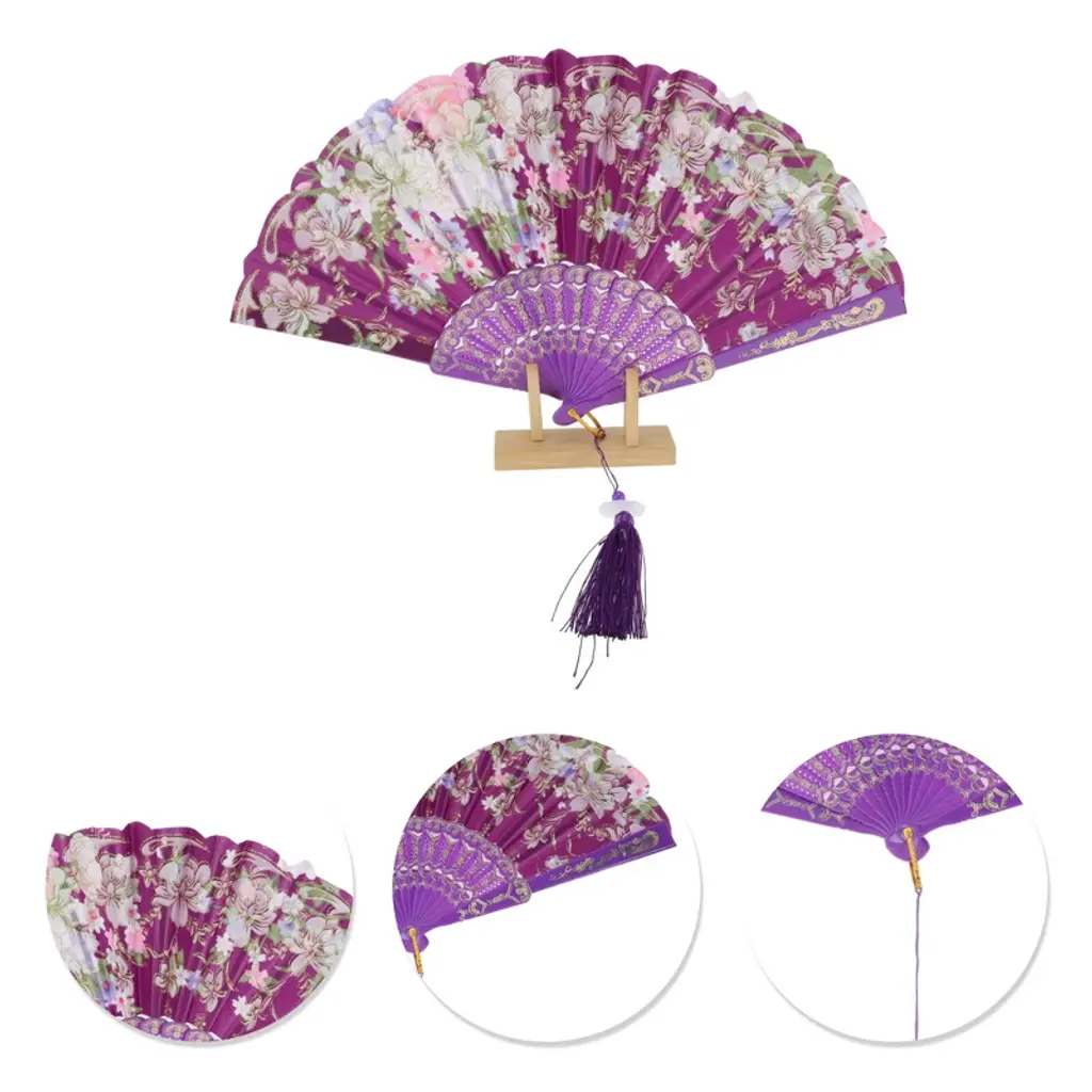 Unique Bargains Hot Stamped Floral With Tassel Folding Fan Purple 1 Pc