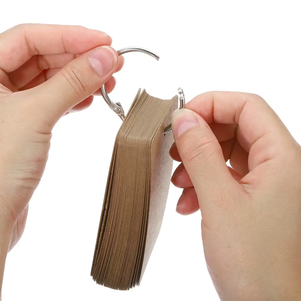 These compact cards are easy to carry around. The curved corners prevent scratches on your fingers. The included rings allow you to string the papers together for easy organization. The cardboard is thick and sturdy, suitable for use with ink pens, fountain pens, and highlighters. Instructions: Write directly on the card surface with a pen. Gently pull the rings outward from both sides, insert the rings through the holes in the paper, and press the clasp. Flashcards are great for note-taking, studying, and working; they're suitable for the office, home, or anywhere else you want to use them. Note: Please carefully check the dimensions before purchasing.