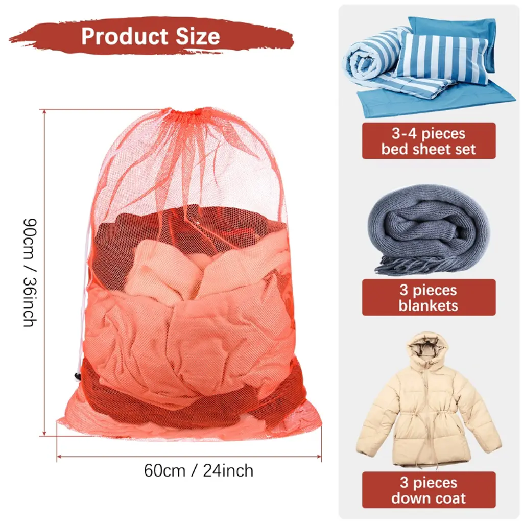 The large mesh laundry bag is a versatile essential for laundry organization, good for home use, travel, and dorm living. This washable laundry bag provides a convenient solution for separating and washing delicate garments, ensuring they stay protected during laundering. Featuring a spacious and durable design, the mesh laundry bag offers ample room to accommodate multiple items while allowing thorough water circulation for effective cleaning. The mesh material enhances visibility and breathability, while the secure drawstring closure ensures items remain enclosed and protected throughout the washing process. Place your delicate garments or small items inside the Large Mesh Laundry Bag before tossing it into the washing machine. Pull the drawstring tightly to secure the contents within the bag. After washing, remove the items from the bag and air dry or tumble dry as needed for optimal care. Avoid overloading the laundry bag to ensure proper cleaning and prevent damage to the bag or its contents. Regularly clean and air dry the bag to maintain and extend its lifespan.