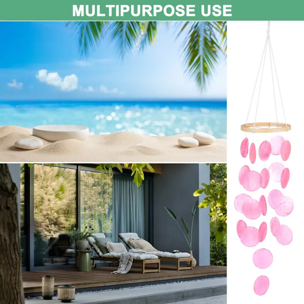 This shell wind chime is a decorative item ideal for outdoor spaces like gardens and patios. Crafted from sea shell pieces, it features durable cords and a coastal-inspired design that captures ocean beauty. The chime enhances outdoor settings by adding a calming ambiance with its soothing sounds. To enjoy the best sound, hang it where it can catch the wind easily. Regular cleaning of the shell pieces is recommended to maintain their luster and prevent debris buildup.