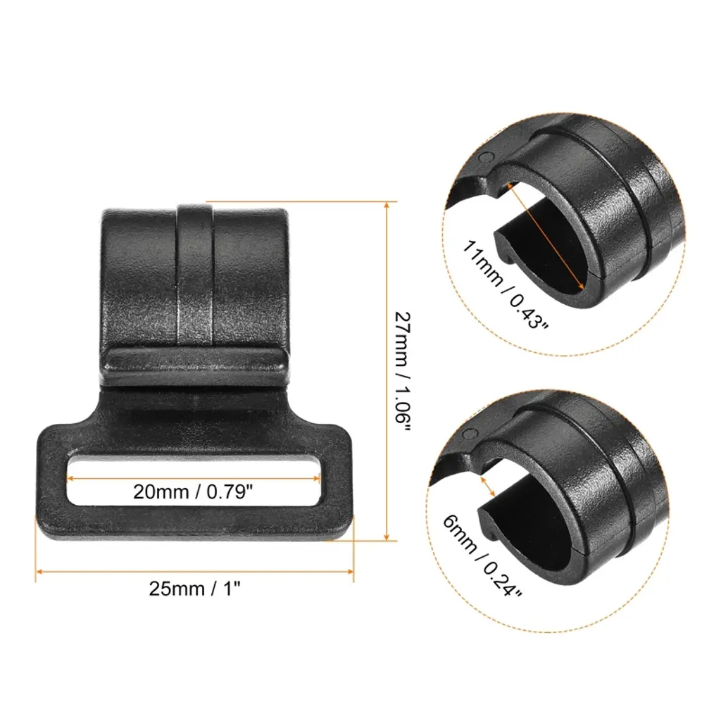 The tent pole clip mainly functions for fixing. It has various applications such as outdoor camping, hiking, boating, fishing, gardening, etc. Widely used for fixing your tent, canopy, awning, rain tarp, canvas, tarpaulin, covers, and more. Color: Black. Material: Plastic. Hole Diameter: 11mm / 0.43". Overall Size:27mmx25mmx17mm / 1.06"x1"x0.67"(L*W*H). Package Content: 10 x Tent Pole Clips. Made of durable plastic material, wear-resistant, lightweight, portable, and reusable. Align the c-clip to the pole and clamp it and the tent straps can be passed through the hole in the clip. Please pay attention to the proper size of the tent fixing clip.