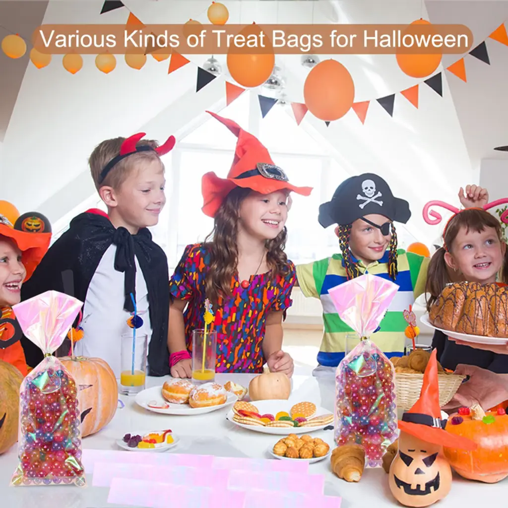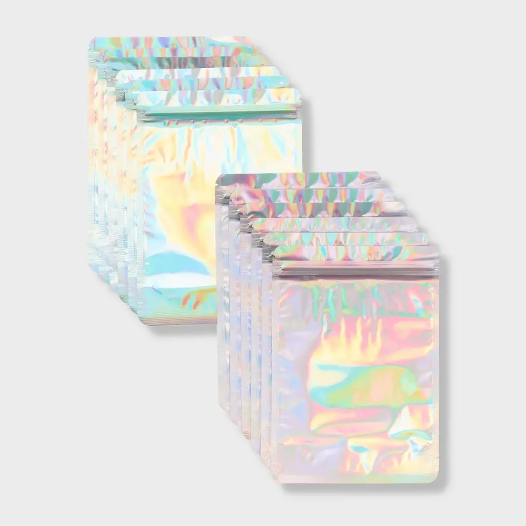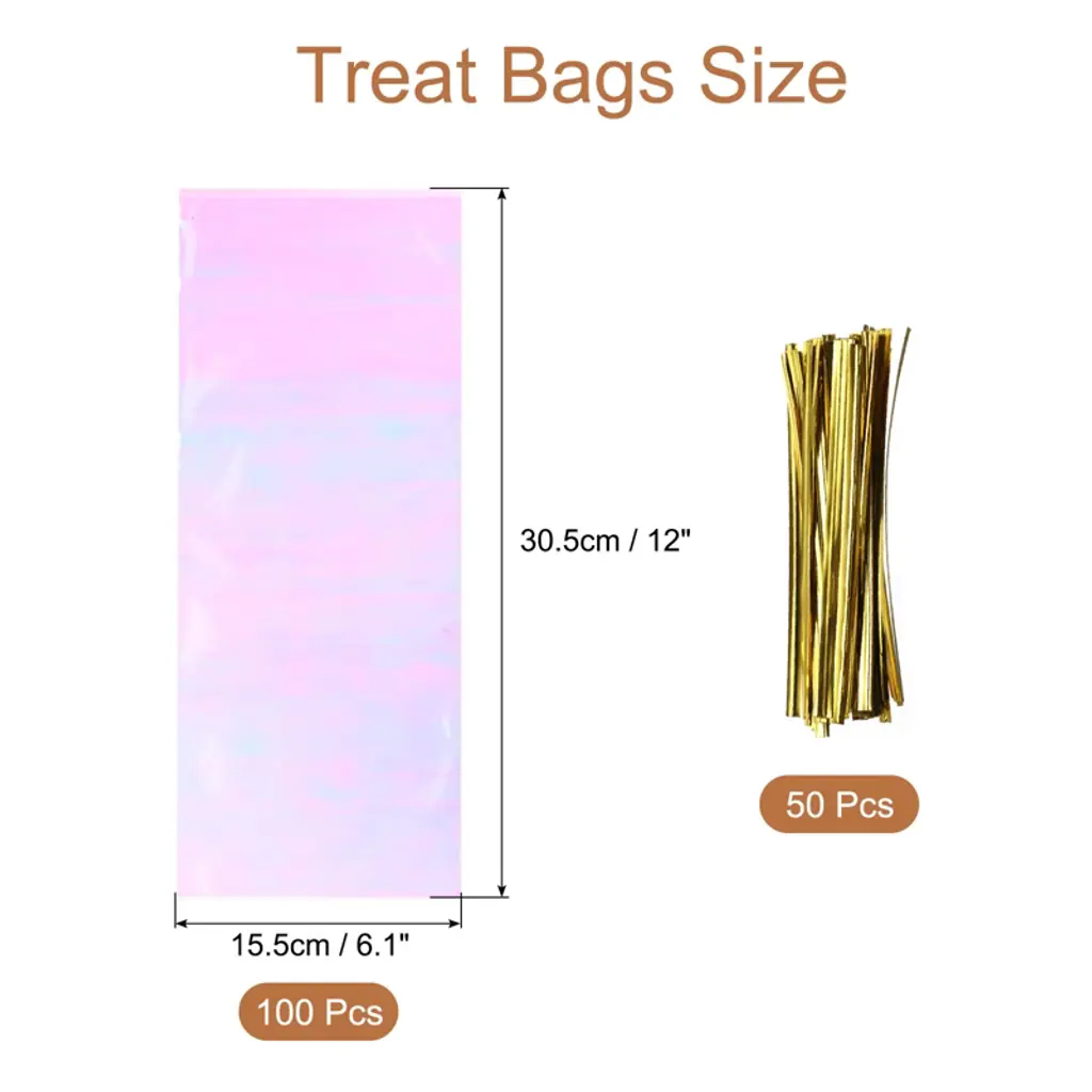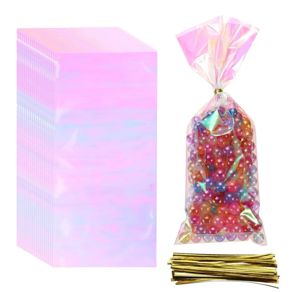 BAGS SUITABLE FOR FOOD: Clear gift bags with a resealable design and excellent vapor-blocking properties keep treats and good fresh and extend the shelf life. Offer a simple and complete packaging plan for your gifts. ALL-PURPOSE TREAT BAGS: These plastic treat bags are a wonderful choice for sharing party favors at events such as birthdays, weddings, or other celebrations. They are also suitable for packaging homemade cookies, muffins, or desserts. RAINBOW FILM DESIGN: The Bags with rainbow film design are the perfect way to make your treats, gifts, candies, and toys stand out! They'll reflect "rainbow" tones under the spotlight, creating a gorgeous external outward appearance for your gifts. DURABLE RIP RESISTANT AND FANTASTIC SEALING: treat bags are made of CPP and PET that are tear and rip-resistant and safer for food.