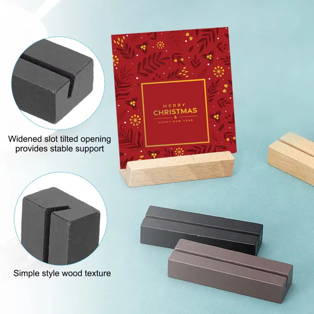 This wooden place card holder serves as a practical display tool that enhances the decor and adds atmosphere. Its simple design makes it an excellent choice for various occasions, including weddings, Christmas, and family gatherings. The holder is perfect for coffee shops, restaurants, and homes, providing a stylish way to display table signs. Crafted from a solid piece of wood, it offers stable support and features a widened slot for holding different items like cards and photos. Its compact design ensures it does not interfere with table settings, making it both functional and aesthetic.