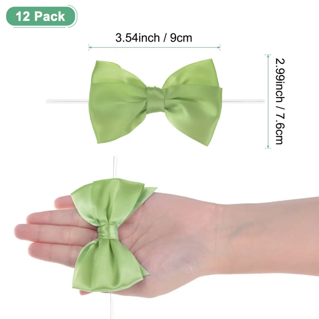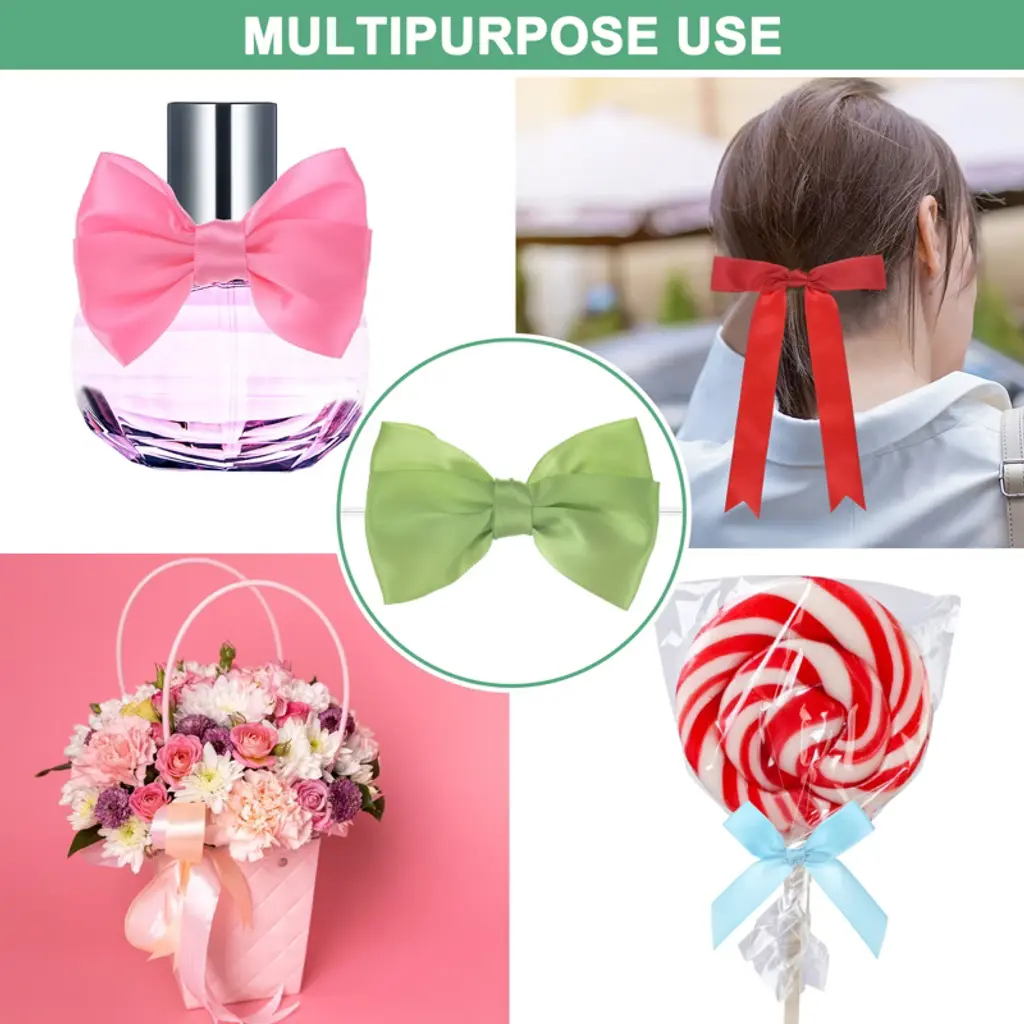 These satin ribbon bows with twist ties are versatile and perfect for various uses. Ideal for hemming and decorating handcrafts, gift bags, bakery candy bags, and present boxes, they can also be used for sleeping bags, tents, and clothing. Made from polyester, these bows offer a fine texture, are resistant to fading and wrinkles, and are flexible to the touch. Their classic and fashionable design makes them suitable for hair accessories, Christmas gifts, baking decorations, gift box packaging, hotel decorations, wedding decorations, flower packaging, and birthday arrangements. Choose a color that matches your project or gift wrapping paper, and secure the bows with twist ties or glue to desired surfaces like gift boxes, cards, or crafts. Adjust the position as needed to achieve the perfect look.