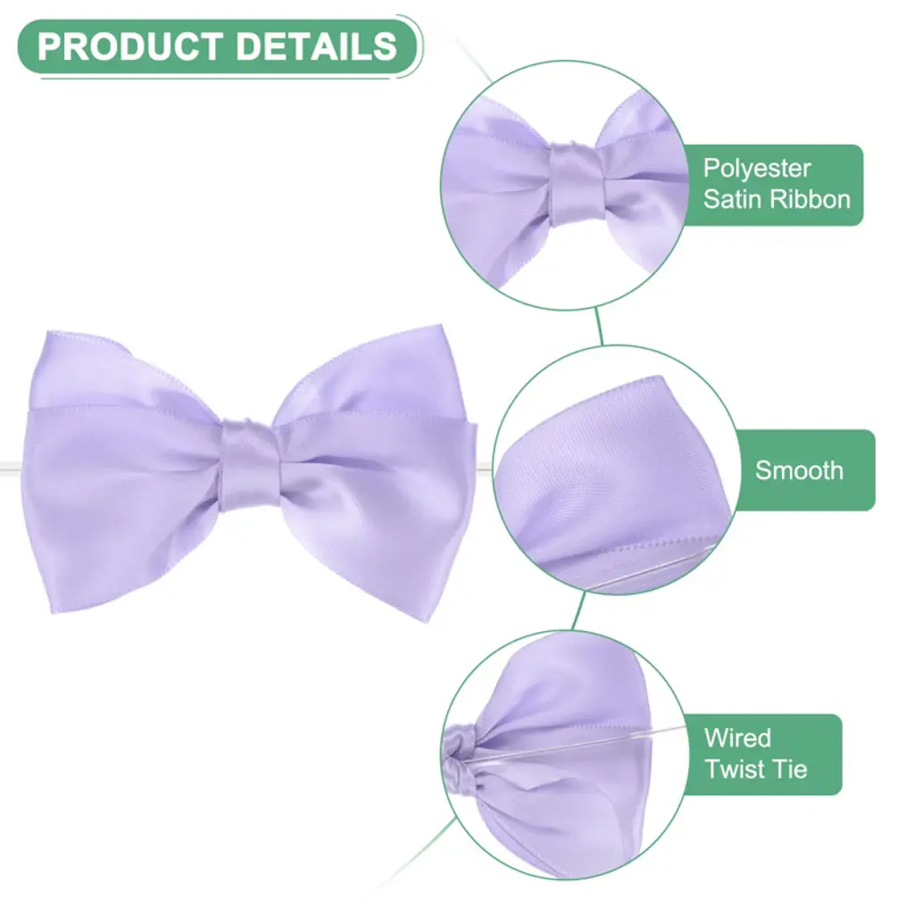These satin ribbon bows with twist ties are versatile and perfect for various uses. Ideal for hemming and decorating handcrafts, gift bags, bakery candy bags, and present boxes, they can also be used for sleeping bags, tents, and clothing. Made from polyester, these bows offer a fine texture, are resistant to fading and wrinkles, and are flexible to the touch. Their classic and fashionable design makes them suitable for hair accessories, Christmas gifts, baking decorations, gift box packaging, hotel decorations, wedding decorations, flower packaging, and birthday arrangements. Choose a color that matches your project or gift wrapping paper, and secure the bows with twist ties or glue to desired surfaces like gift boxes, cards, or crafts. Adjust the position as needed to achieve the perfect look.
