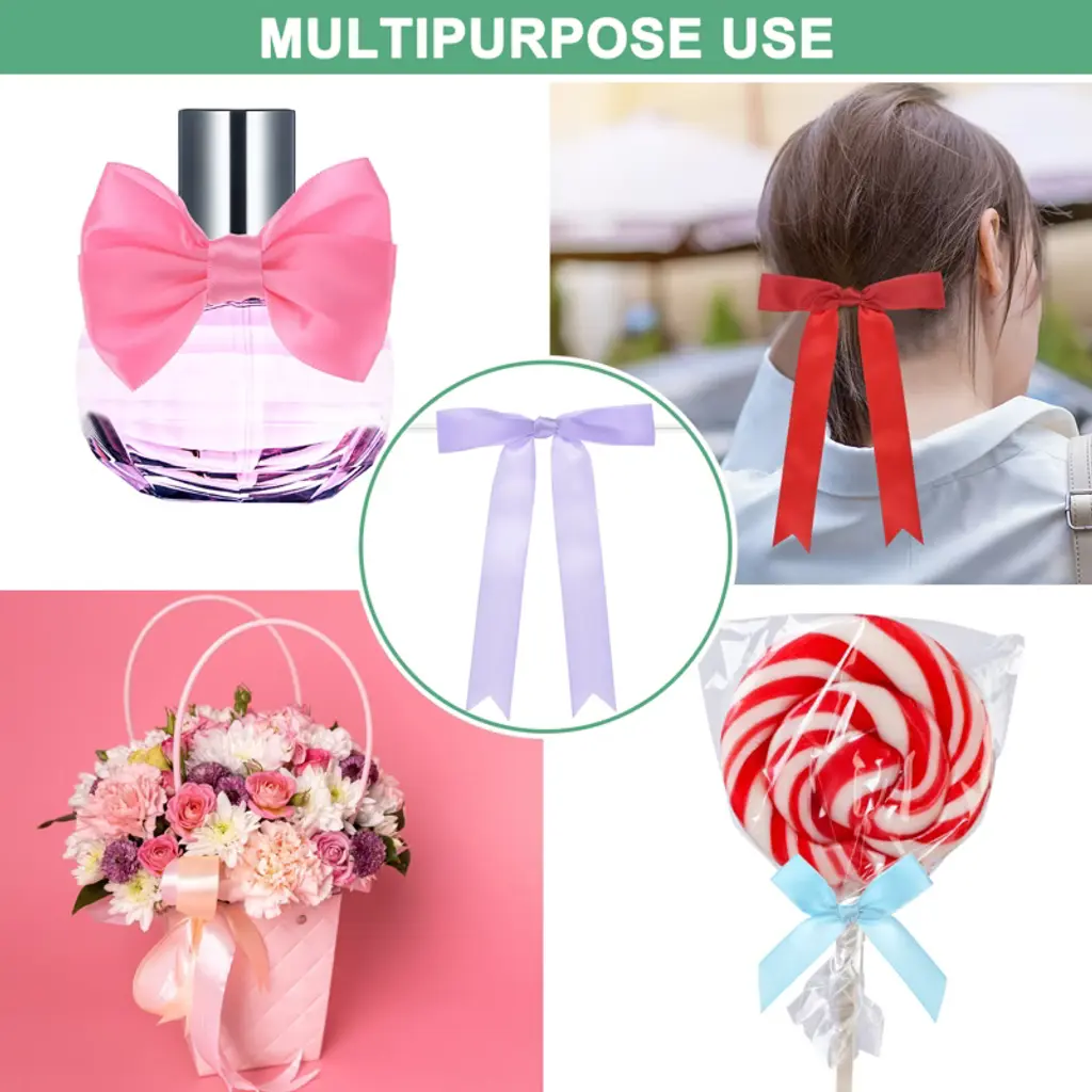 These satin ribbon bows with twist ties are versatile and perfect for various uses. Ideal for hemming and decorating handcrafts, gift bags, bakery candy bags, and present boxes, they can also be used for sleeping bags, tents, and clothing. Made from polyester, these bows offer a fine texture, are resistant to fading and wrinkles, and are flexible to the touch. Their classic and fashionable design makes them suitable for hair accessories, Christmas gifts, baking decorations, gift box packaging, hotel decorations, wedding decorations, flower packaging, and birthday arrangements. Choose a color that matches your project or gift wrapping paper, and secure the bows with twist ties or glue to desired surfaces like gift boxes, cards, or crafts. Adjust the position as needed to achieve the perfect look.