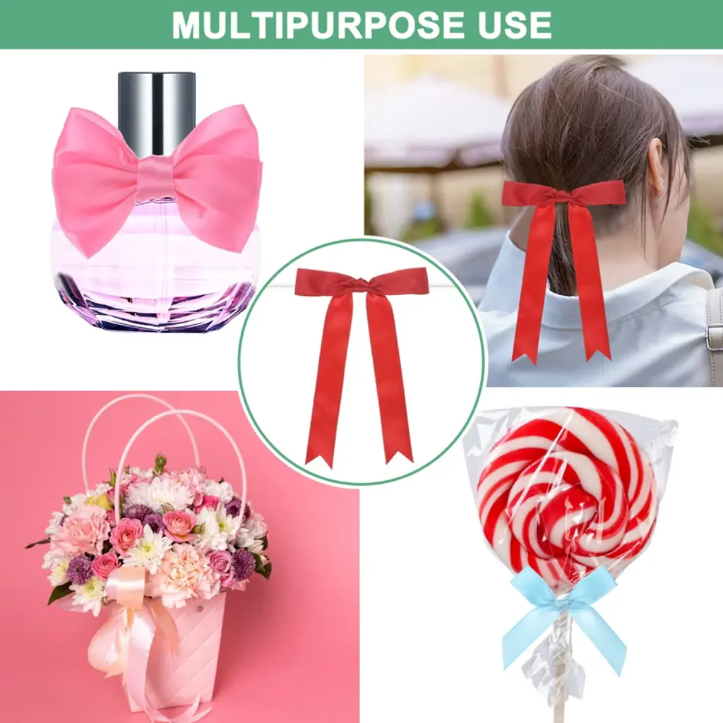 These satin ribbon bows with twist ties are versatile and perfect for various uses. Ideal for hemming and decorating handcrafts, gift bags, bakery candy bags, and present boxes, they can also be used for sleeping bags, tents, and clothing. Made from polyester, these bows offer a fine texture, are resistant to fading and wrinkles, and are flexible to the touch. Their classic and fashionable design makes them suitable for hair accessories, Christmas gifts, baking decorations, gift box packaging, hotel decorations, wedding decorations, flower packaging, and birthday arrangements. Choose a color that matches your project or gift wrapping paper, and secure the bows with twist ties or glue to desired surfaces like gift boxes, cards, or crafts. Adjust the position as needed to achieve the perfect look.